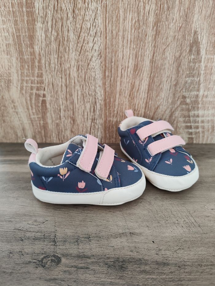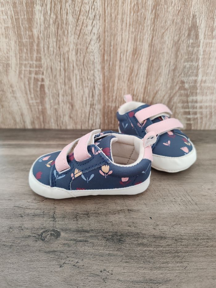 Chaussons style baskets bébé fille à scratch, bleu et imprimé fleuri. Tape à l'œil, neuves, taille 3/6 mois.