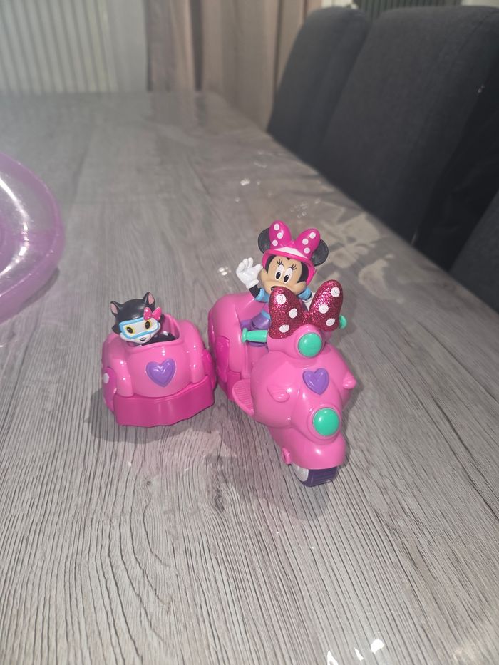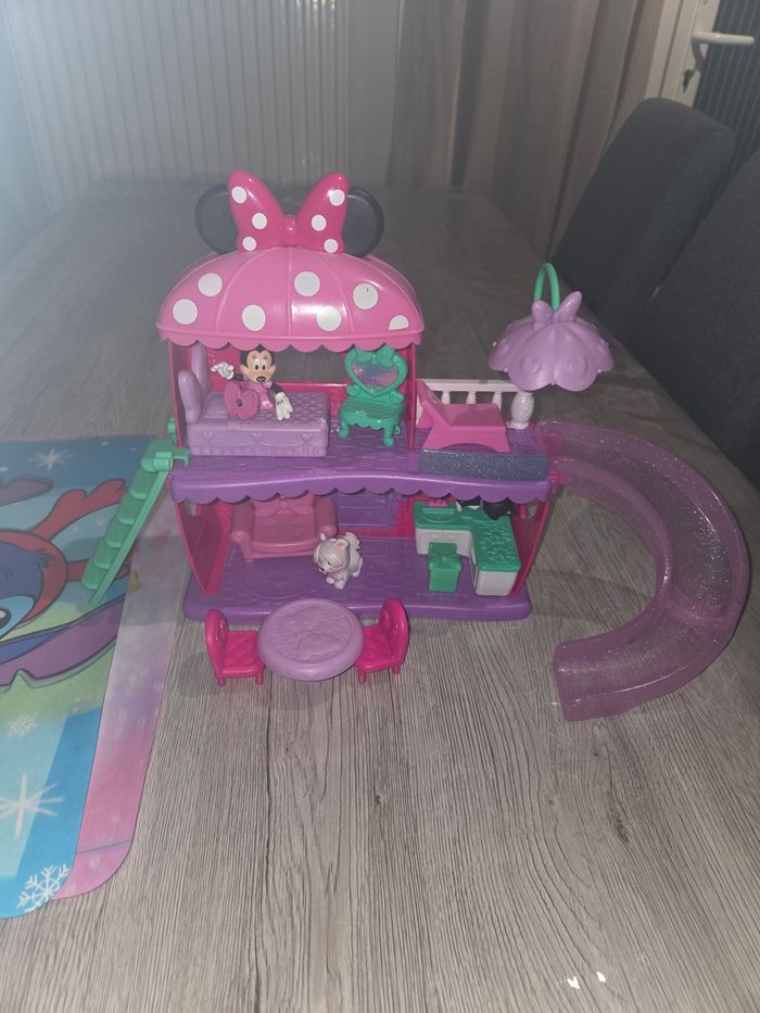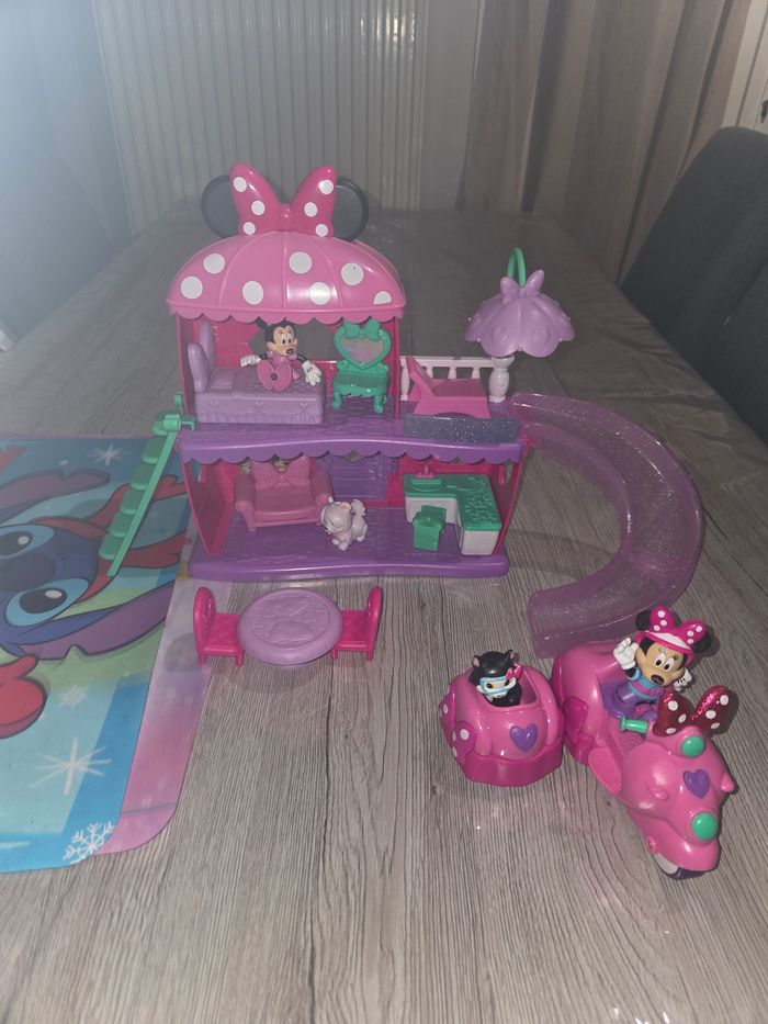Maison minnie avec son chien et tout le mobilier en tres bon etat Voiture avec side car et son chat en tres bon etat