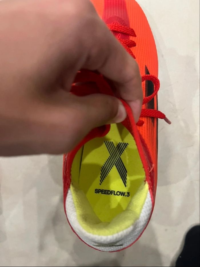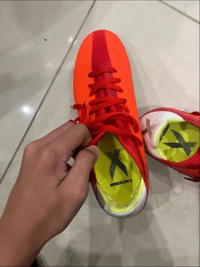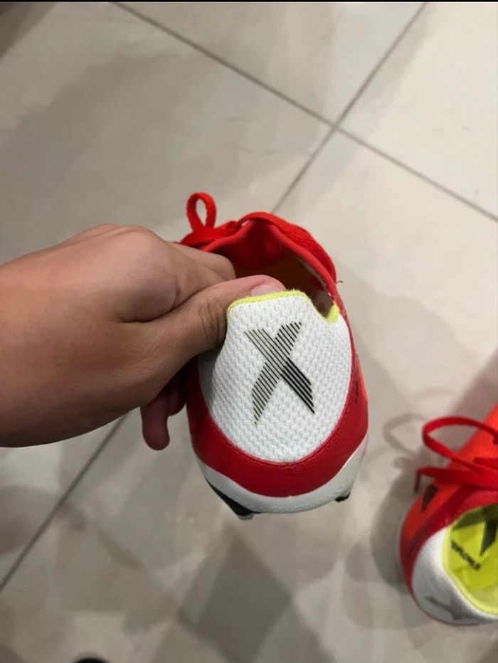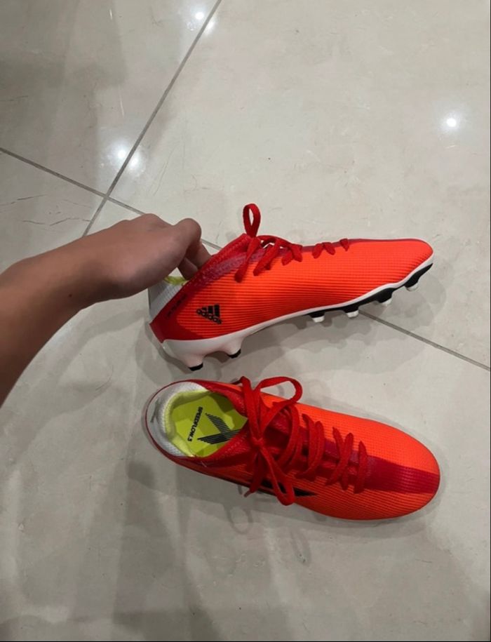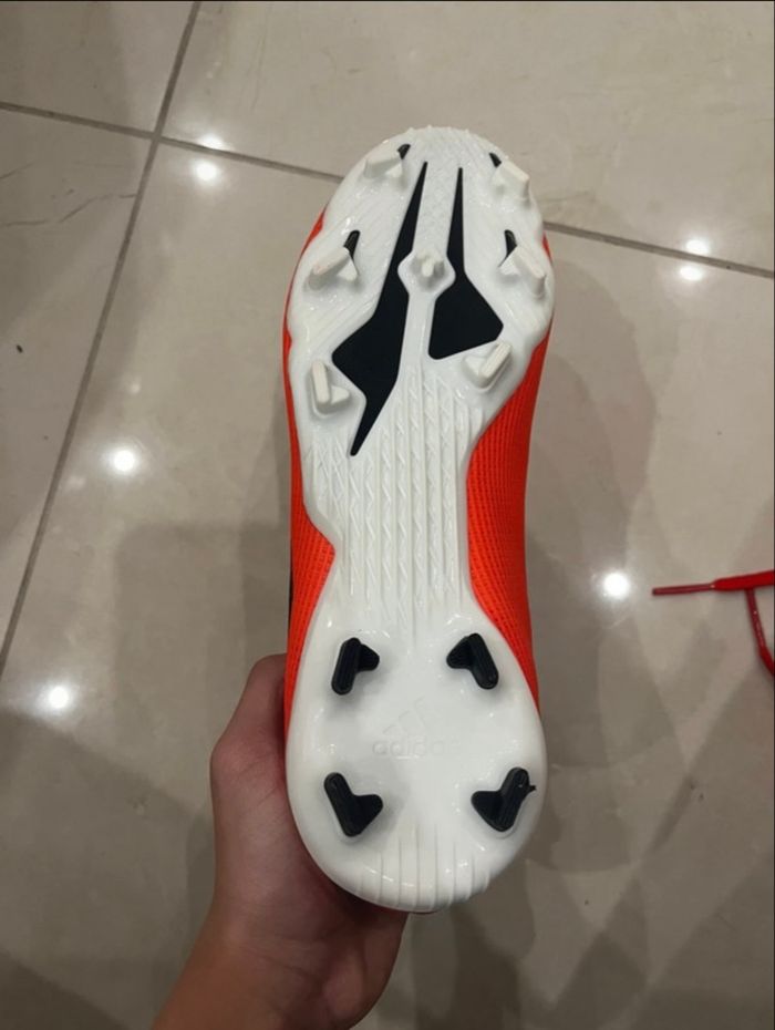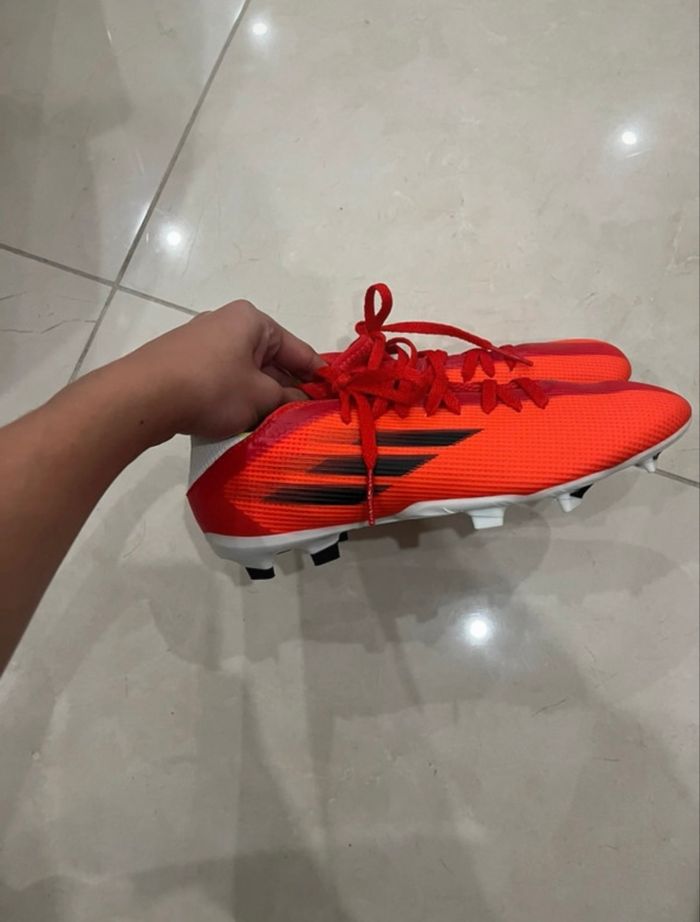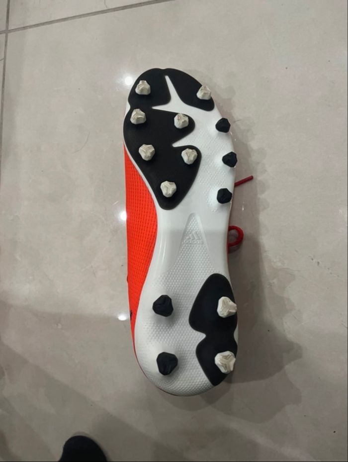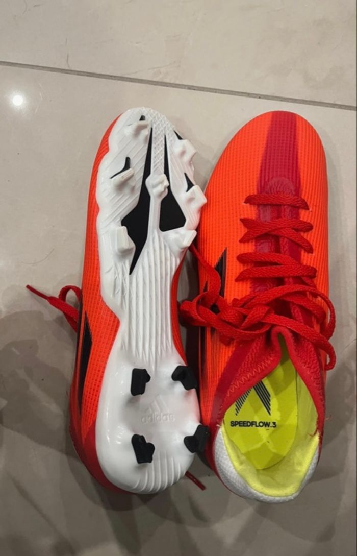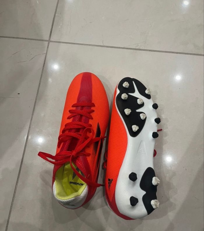 Chaussures de football Adidas en rouge vif avec crampons noirs, en excellent état. Livraison rapide et soignée.