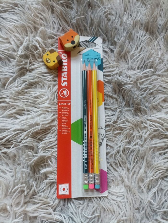 Pochette de 3 crayons graphite avec bout gomme De marque Stabilo Neufs avec étiquette 2 gommes animaux offerts avec le lot D'autres articles de fournitures scolaires disponibles dans mon dressing #ap03fourniturescolaire #stabilo #crayongraphite