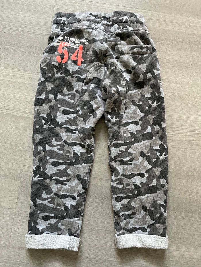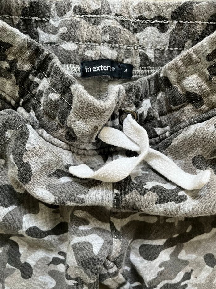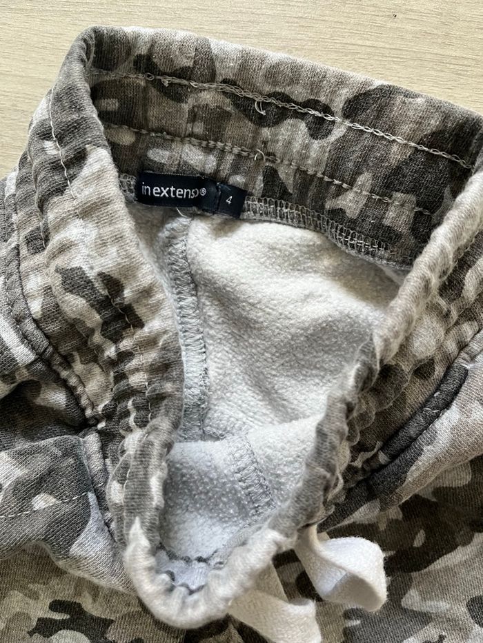 Jogging gris imprimé camouflage. 60% coton + 40% polyester. 2 poches avant + taille ajustable par cordon. Fausse poche arrière. Marque In extenso. Taille 4 ans