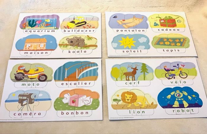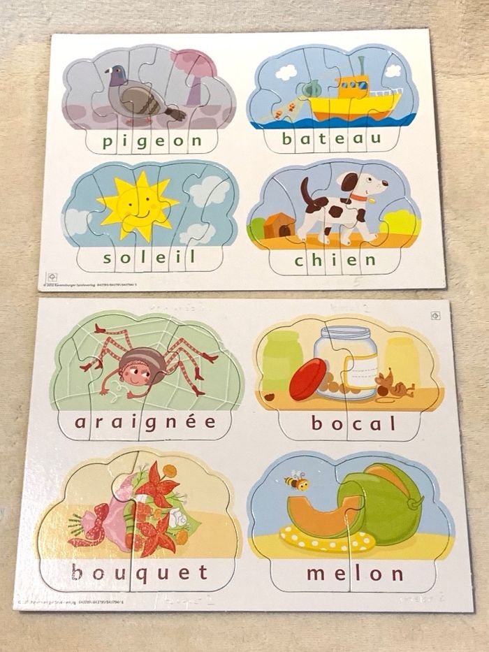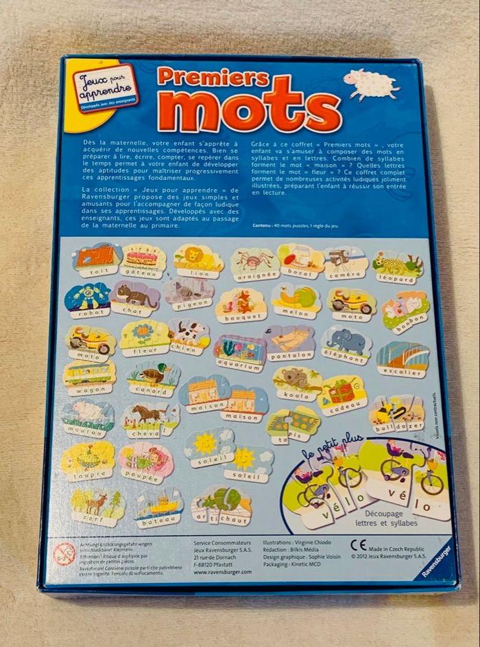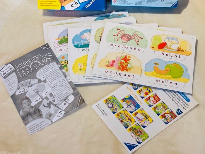 Petits Puzzles Premiers Mots Ravensburger  Jeux pour apprendre, 40 mots puzzles (20 mots syllabes et 20 mots lettres)  Notice. Dès 4 ans *Mots écrits avec un crayon, sur le carton blanc avec le numéro contenant de pièces de chaque puzzle pour guider l'enfant. Complet, boîte légèrement abîmée, traces d'usure, voir photos   #puzzle #premiersmots #Ravensburger #syllabes #4ans