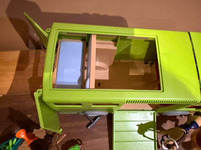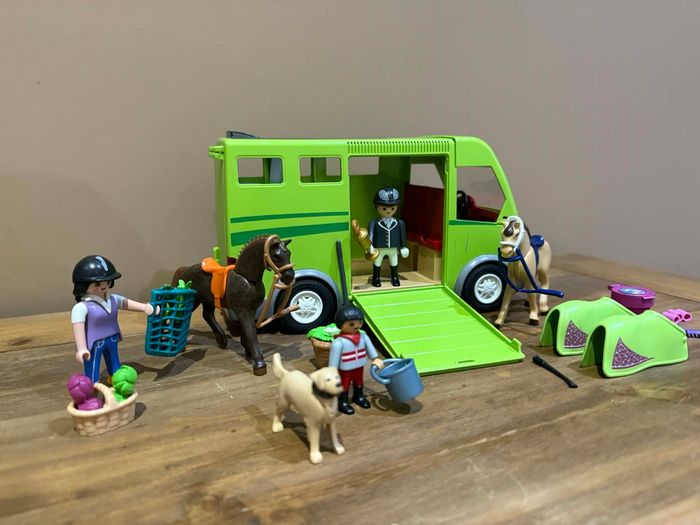 Playmobil set 6928 Riding Stables Cavalier avec van et cheval Très bon état Manque les retros au van Le reste des éléments a été modifié avec des personnages, accessoires et animaux en plus Playmobil set 6928 Riding Stables Cavalier avec van et cheval