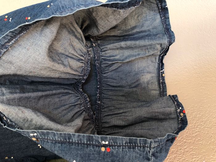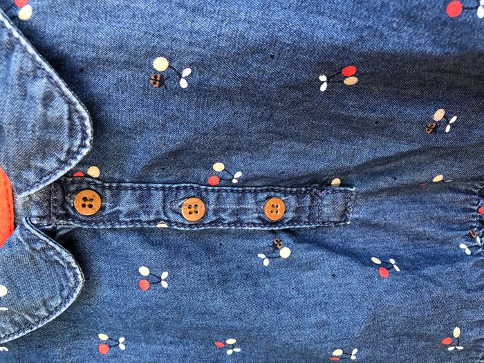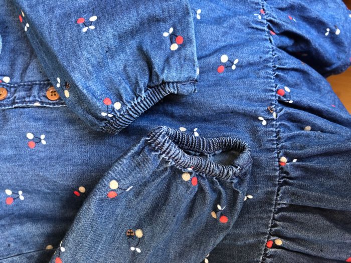Robe Obaïbi, Taille 6 mois/ 68 cm, Mi-saison / hiver, Manches longues avec des élastiques pour resserrer le bout des manches. Très jolie robe en jean bleu (pas aussi épais que du vrai jean), motifs cerises rouges, et grises, et coccinelles. Col Claudine. Ouverture par boutons sur l’avant. En très bon état, sans trou ni tache. 🌸 Vous aimez cet article ? N’oubliez pas de visiter le reste de mon dressing en filtrant les tailles.