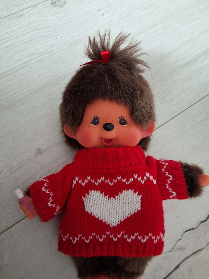 Peluche Mochhichi 20 cm fille pull rouge en laine cœur blanc Neuf - photo numéro 1