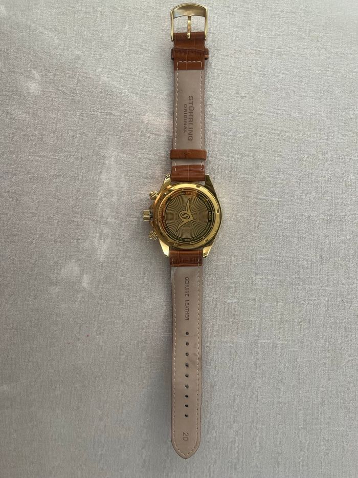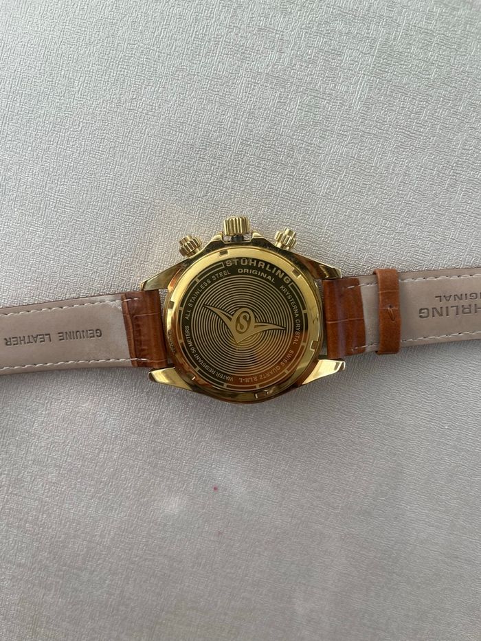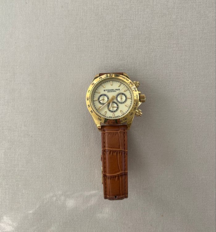 Montre Stührling avec un cadran doré et un bracelet en cuir marron. Le cadran affiche trois sous-cadrans et des détails dorés. Livraison rapide et soignée.