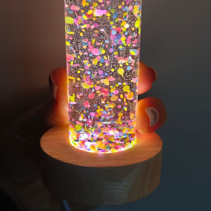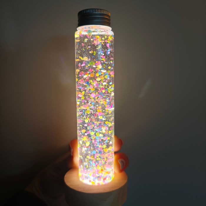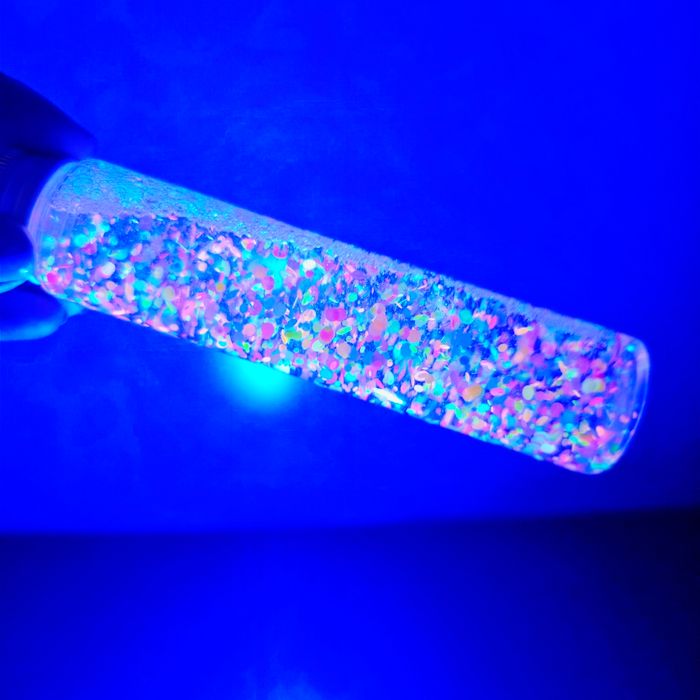 Bouteille sensorielle snoezelen. Utilisable avec la lumière bleue pour l'effet fluorescent ou bien à la lumière naturelle. Confettis fluorescents. Bouteille scellée. 🔒