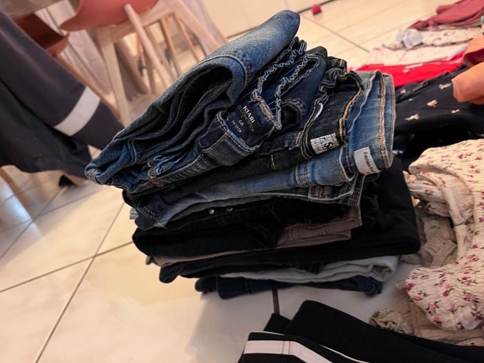Lot vêtement fille 6 ans Une dizaine de jean , il y’a des blouses , des t shirt manche longue , courtes , 2 jogging 1 ensemble survêtement ,pull . 1 blouson étoile rose en très bonne état Et je donne dans le lot 1 blouson gris ( bien porter ) mais peut être encore porter même pour rester dans le jardin (etc) Peut être 2 jeans en 8 ans dans le lot .