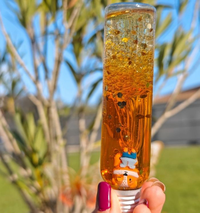 Bouteille sensorielle petit renard 🦊 Petites paillettes dorées ✨ et effet bulles quand elle est doucement secouée. 🫧 Scellée et incassable. Le prix inclut un bouchon en aluminium mais il est possible de remplacer par un bouchon en bois, pour une finition plus naturelle, pour un petit supplément de 1€ (envoyez-moi un petit message).
