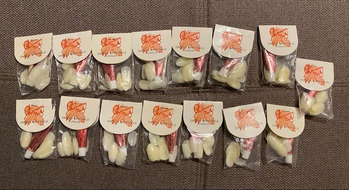 Lot de 15 sachets de 24 faux ongles chacun ainsi qu’une colle dans chaque sachet. Un des sachets à le carton d’abimé mais il n’a pas été ouvert. Ils sont neufs