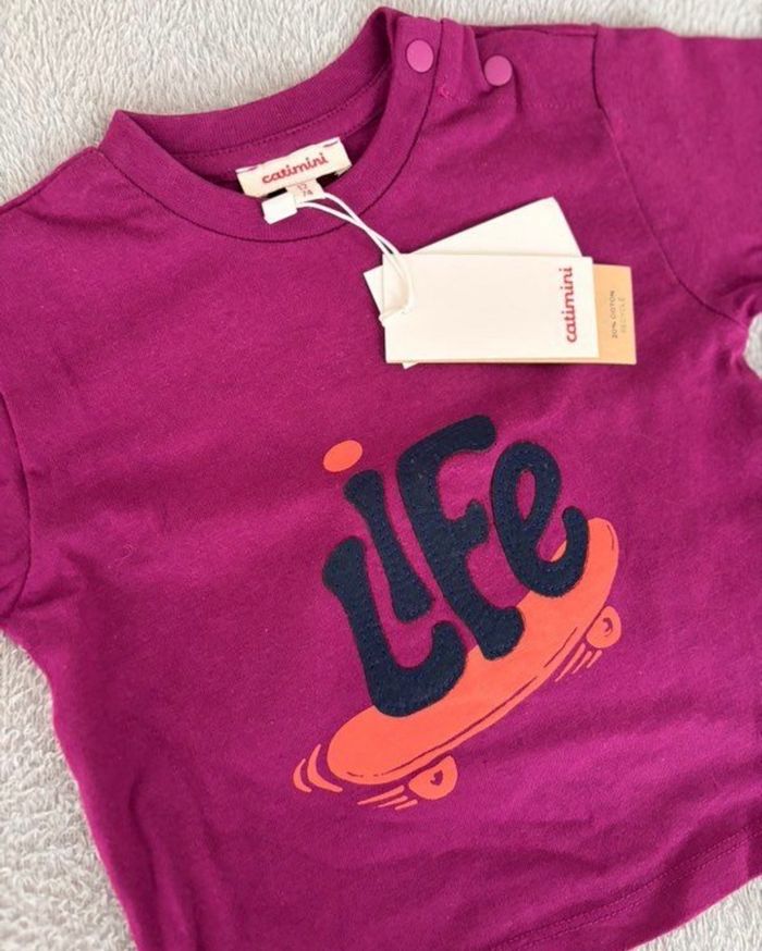 Vends t-shirt manches longues Catimini, taille 12 mois, neuf avec étiquette. • Couleur : violet / prune • Motif « Life » avec skateboard • Boutons pression à l’épaule (pratique pour l’habillage) • Marque de qualité, coton doux • Jamais porté Envoi rapide et soigné N’hésitez pas à regarder le dressing ☺️ ‼️Photos et videos seront faites avant chaque envoi‼️