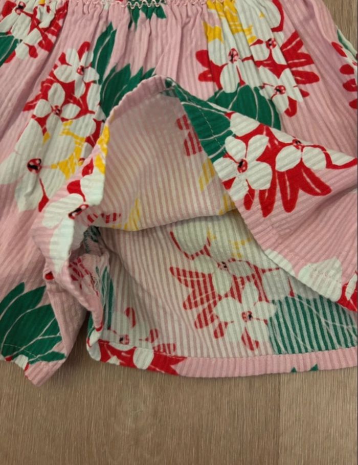 Magnifique short à l'aspect "jupe-short" de la marque Catimini. Très léger et confortable pour l'été, avec un bel imprimé floral tropical (hibiscus) sur fond rose pastel à fines rayures. • État : Neuf, jamais porté, avec étiquette d'origine. • Taille : 18 mois (80 cm). • Détails : • Taille entièrement élastiquée et smockée pour un enfilage facile. • Coupe évasée style "jupe-short" très mignonne. • Matière texturée style seersucker/gauffré. • Prix d'origine : 29,00 € Envoi rapide et soigné ‼️Photo et vidéo de l’emballage avant envoi‼️