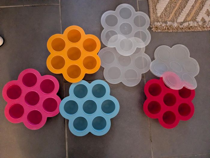 Lot 4 multiportions béaba couvercle plusieurs couleurs Vends ce lot Béaba multiportions avec 6 alvéoles par bac 3 de la marque béaba + 1 d’une autre marque Il y a juste un couvercle en mois