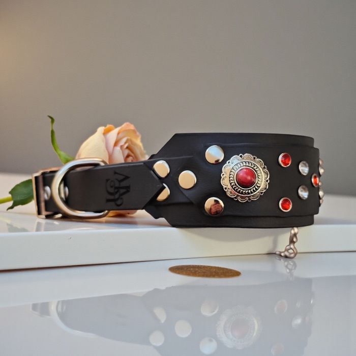 Ce collier superposé en biothane allie élégance, caractère et robustesse. Sa base large de 50 mm en biothane noir offre un excellent maintien, tandis que le biothane de 38 mm superposé sur le dessus est sublimé par de strass rouges, apportant une touche intense et raffinée. Conçu pour durer, il est équipé d’une boucle en acier inoxydable de 38 mm, résistante à l’humidité et à l’usure du temps. Le biothane, matière imperméable et facile d’entretien, en fait un collier aussi pratique qu’esthétique, idéal pour un usage quotidien comme pour les grandes occasions. 📏 Convient pour un tour de cou de 44 à 54 cm 🐾 Largeur totale : 50 mm 🔩 Bouclerie : acier inoxydable 💎 Détails : strass rouges Un collier au look affirmé, parfait pour les chiens qui ne passent pas inaperçus ❤️‍🔥