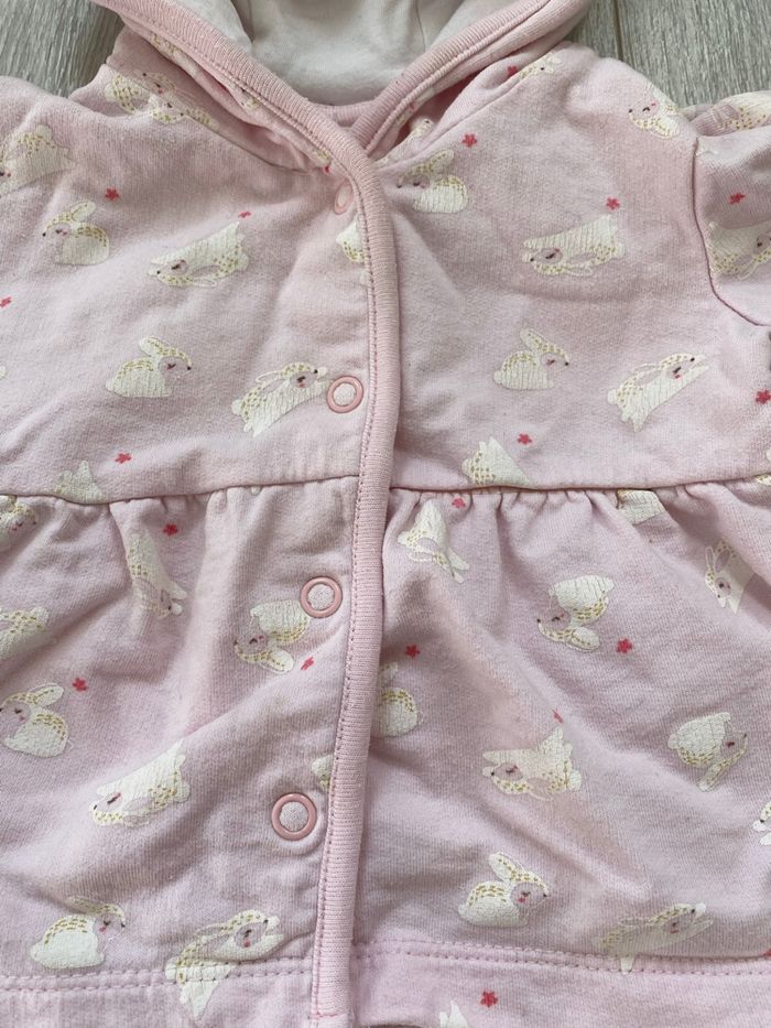 Sweat à capuche rose motif petits lapins Fermeture par boutons pression Taille 6 mois Très bon état