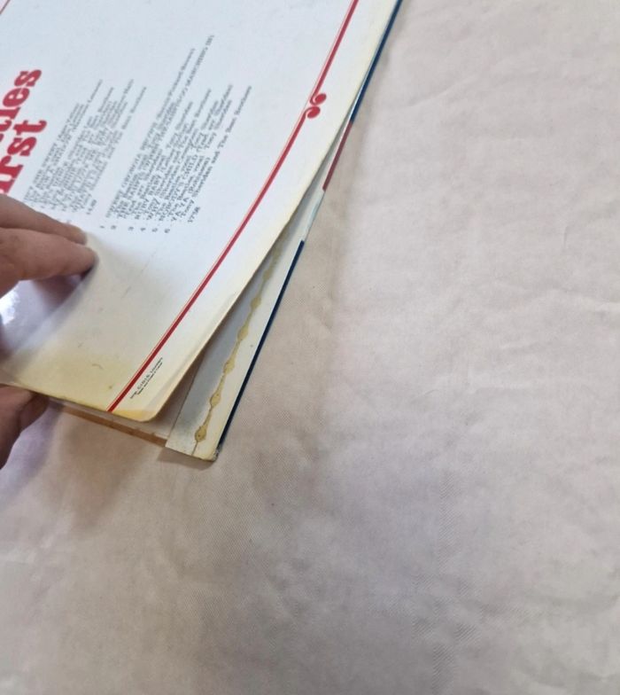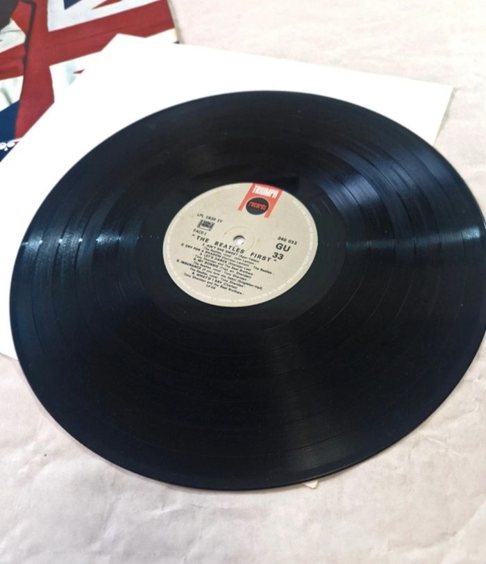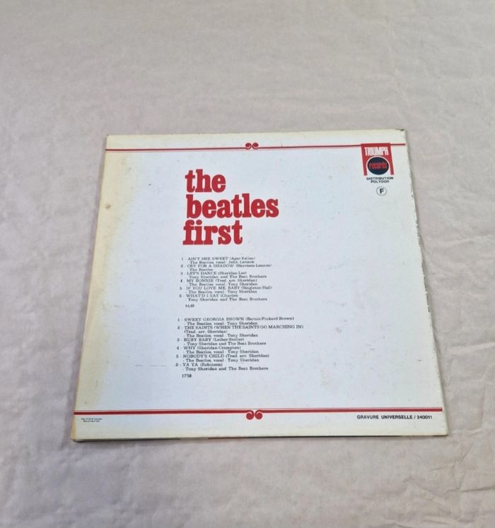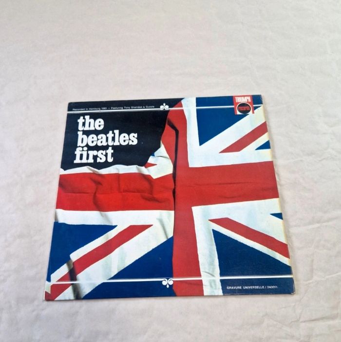 Bonjour. ​Vinyle 33 tours des Beatles, album "The Beatles First" incluant les enregistrements de Hambourg avec Tony Sheridan. Pressage français sous le label Triumph Records, distribution Polydor. ​L'objet est complet (Pochette + Sous-pochette blanche + Vinyle). La pochette cartonnée présente des signes de manipulation avec des frottements sur les tranches, et un décollement de celle-ci ( voir photos ) ainsi qu'une légère décoloration au verso. Le disque est en très bon état. Mention "Gravure Universelle" présente sur la pochette. ​ #thebeatles #vinyle #rock #tonysheridan #vintage #33T #collector