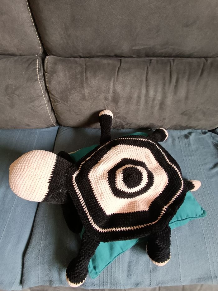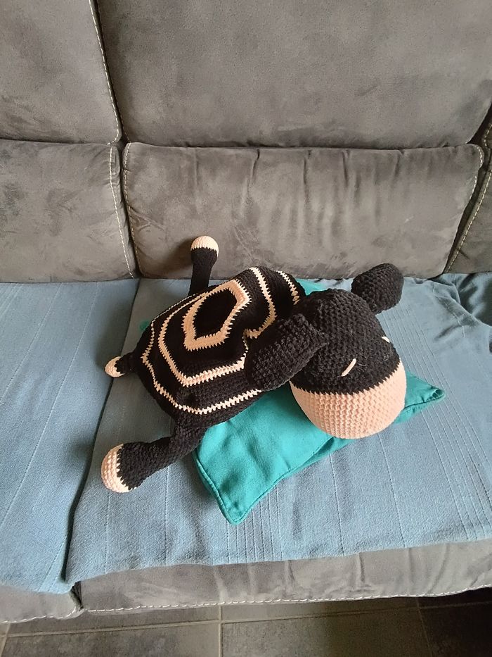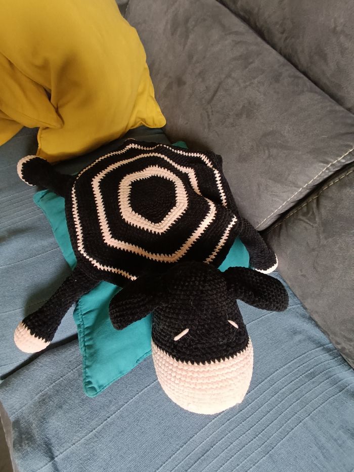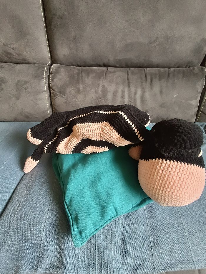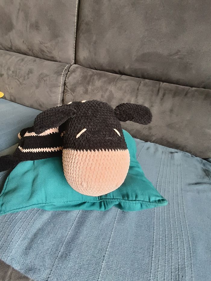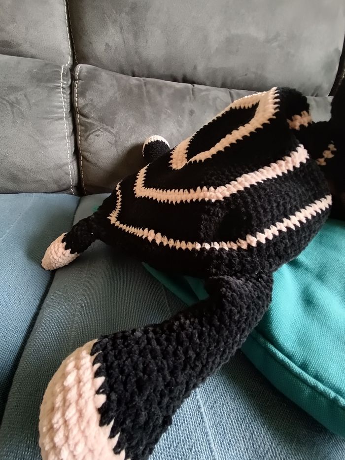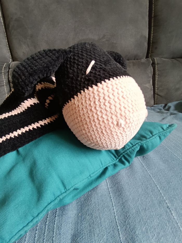 Rose clair et noir Fil chenille 100% polyester Tête, queue et pâtes rembourrage synthétique Amigurumi Tout doux Mesure 55 cm en longueur du bout de la queue au bout de la tête 53 cm du bout de la patte à l'autre Décoration jeu peluche plat