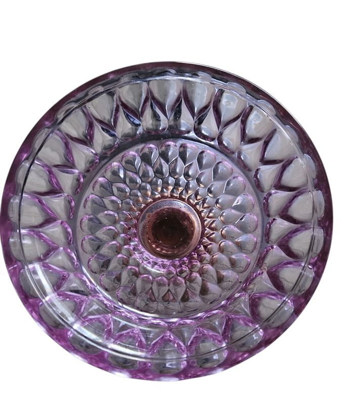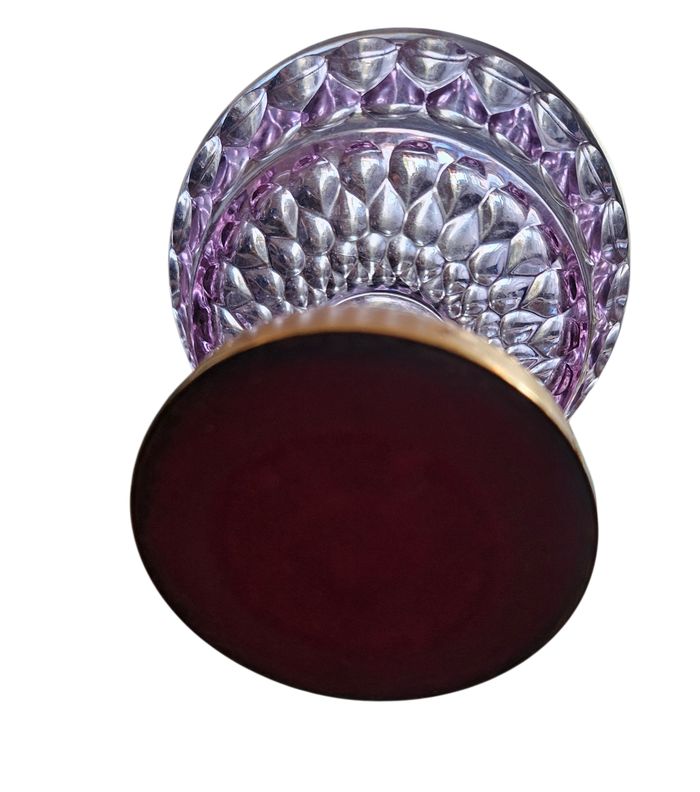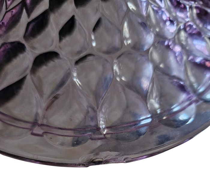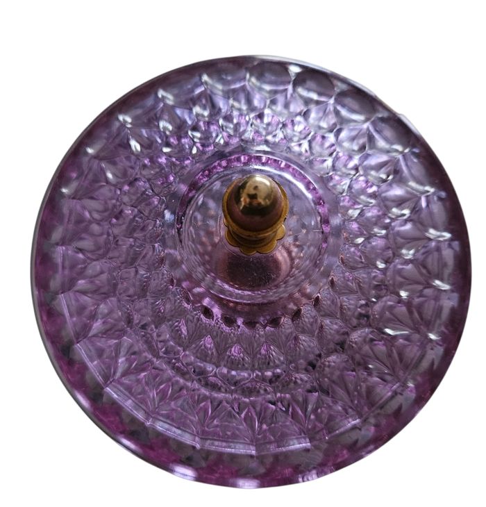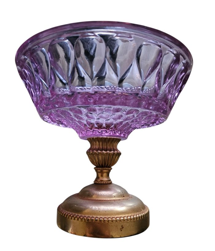 Cet objet est une coupe décorative avec couvercle, montée sur un pied, qui semble être à la fois élégante et ancienne. Matériau principal : Le récipient est en verre violet translucide, probablement du verre pressé ou moulé, avec des motifs en relief en forme d’écailles ou de pétales. Couleur : Le violet est riche et lumineux, ce qui donne à l’objet un aspect raffiné et décoratif. Forme : La coupe est large et arrondie, avec un couvercle bombé assorti. Le couvercle est surmonté d’un petit bouton en métal doré servant de poignée. Base : La coupe repose sur un pied en métal doré ou en laiton, avec une base circulaire solide qui assure la stabilité. Style : L’ensemble évoque un style vintage ou classique, possiblement inspiré d’objets décoratifs du XIXe ou du début du XXe