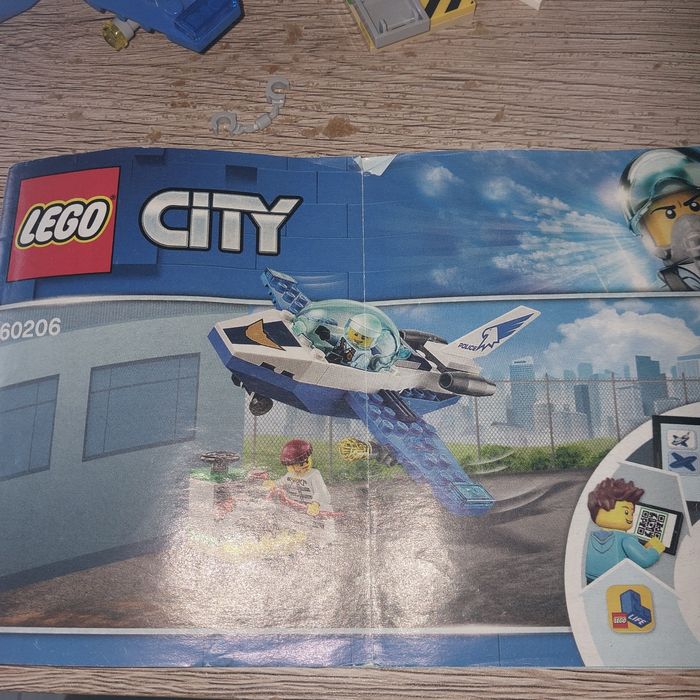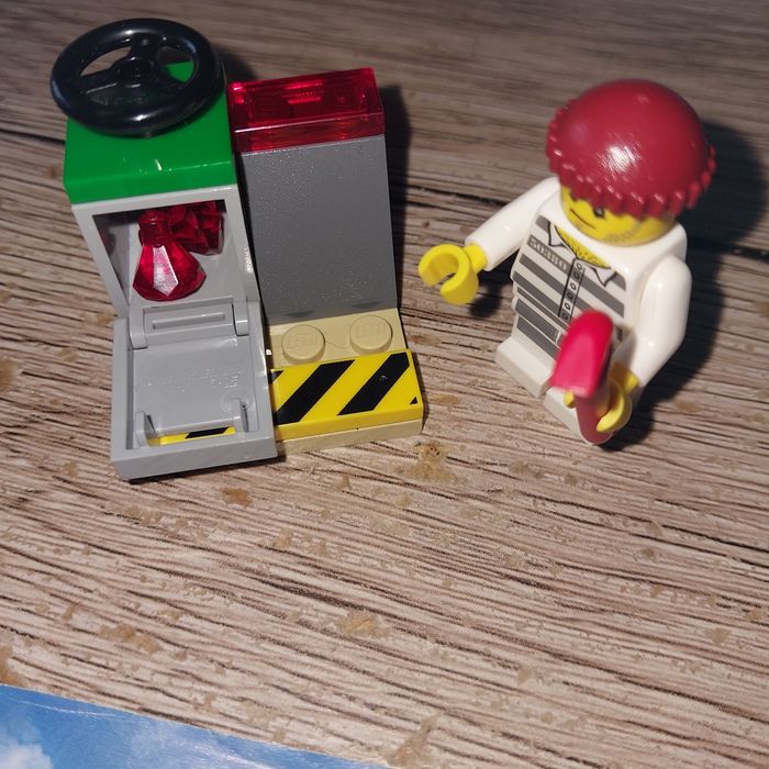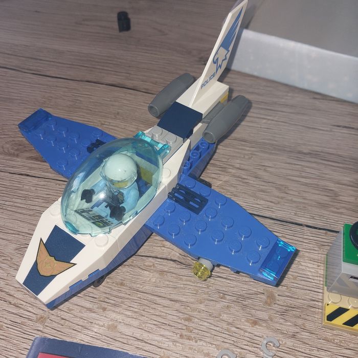 Lego avion de police avec le voleur Complet il y a juste la lumière sous l aille de l'avion qui ne correspond pas au modèle. Notice incluse mais je ne possède plus la boîte.