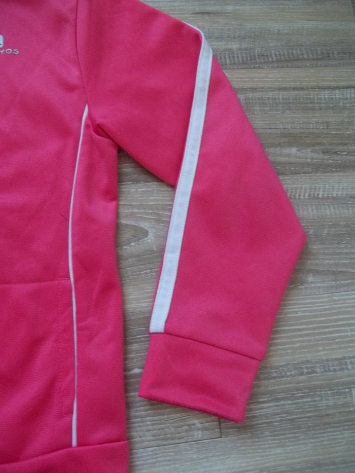 Haut de jogging zippé 100 % polyester rose vif, col intérieur bleu marine très foncé, bandes blanches sur manches et côtés devant, logo "Domyos" argenté sur poitrine gauche. 2 poches non fermées sur ventre, petit col montant, poignets et bas doublés. Longueur 44 cm, manches 41 cm, largeur épaules 30 cm, aisselles 35 cm. Sport2