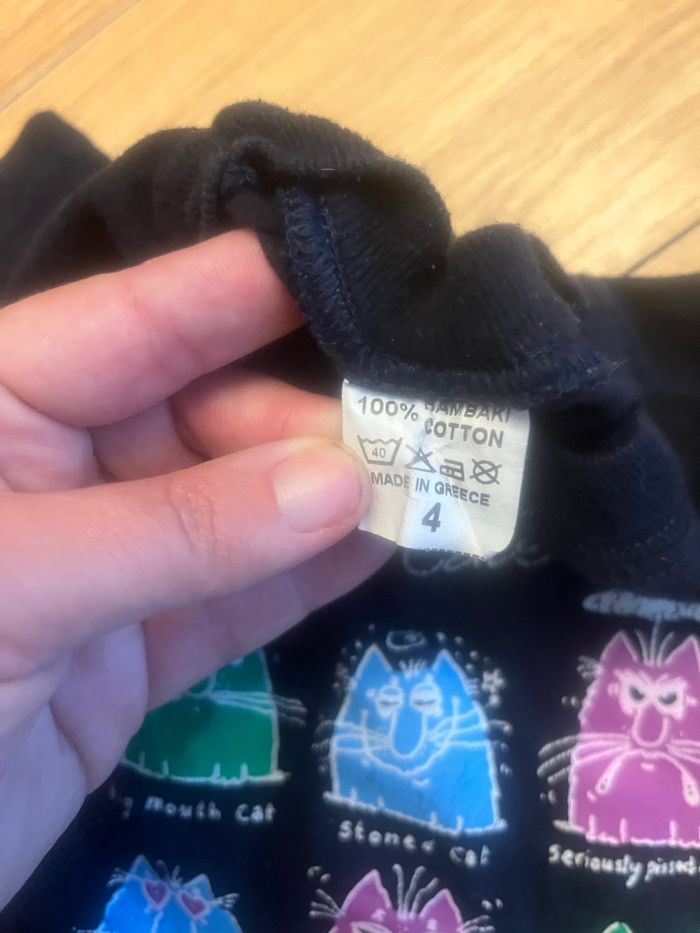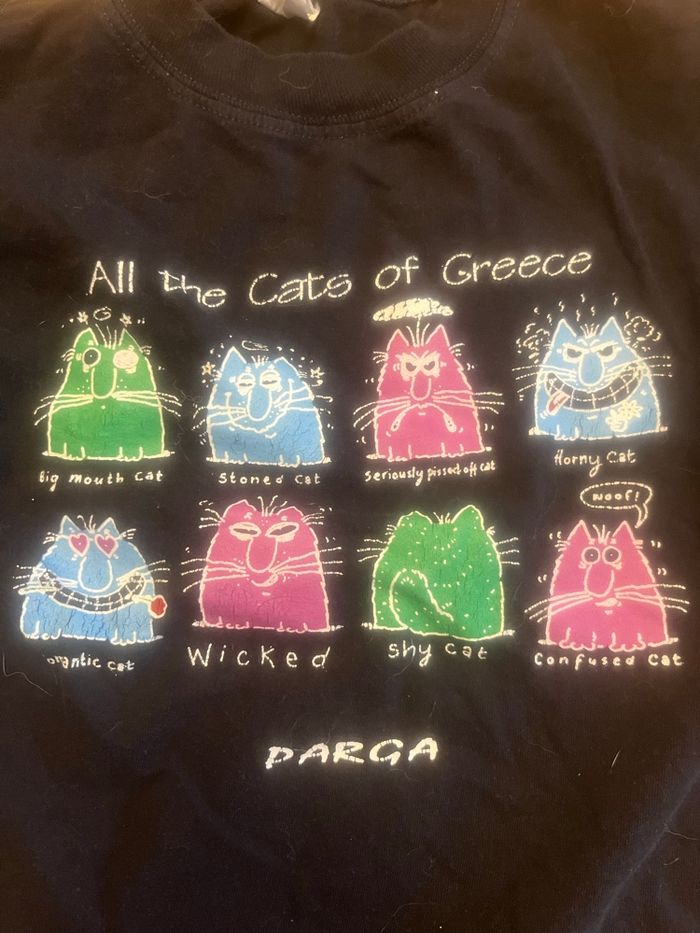 Description : Adorable t-shirt noir pour enfant, taille 4 ans, avec un imprimé très mignon et coloré représentant « All the Cats of Greece » (différents chats illustrés). Souvenir de Parga (Grèce), original et fun 🌞🇬🇷 • Taille : 4 ans • Couleur : noir • Motif : chats multicolores • État : très bon état général Idéal pour un petit fan de chats 🐾
