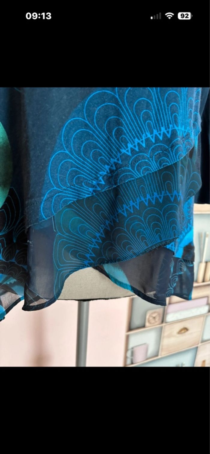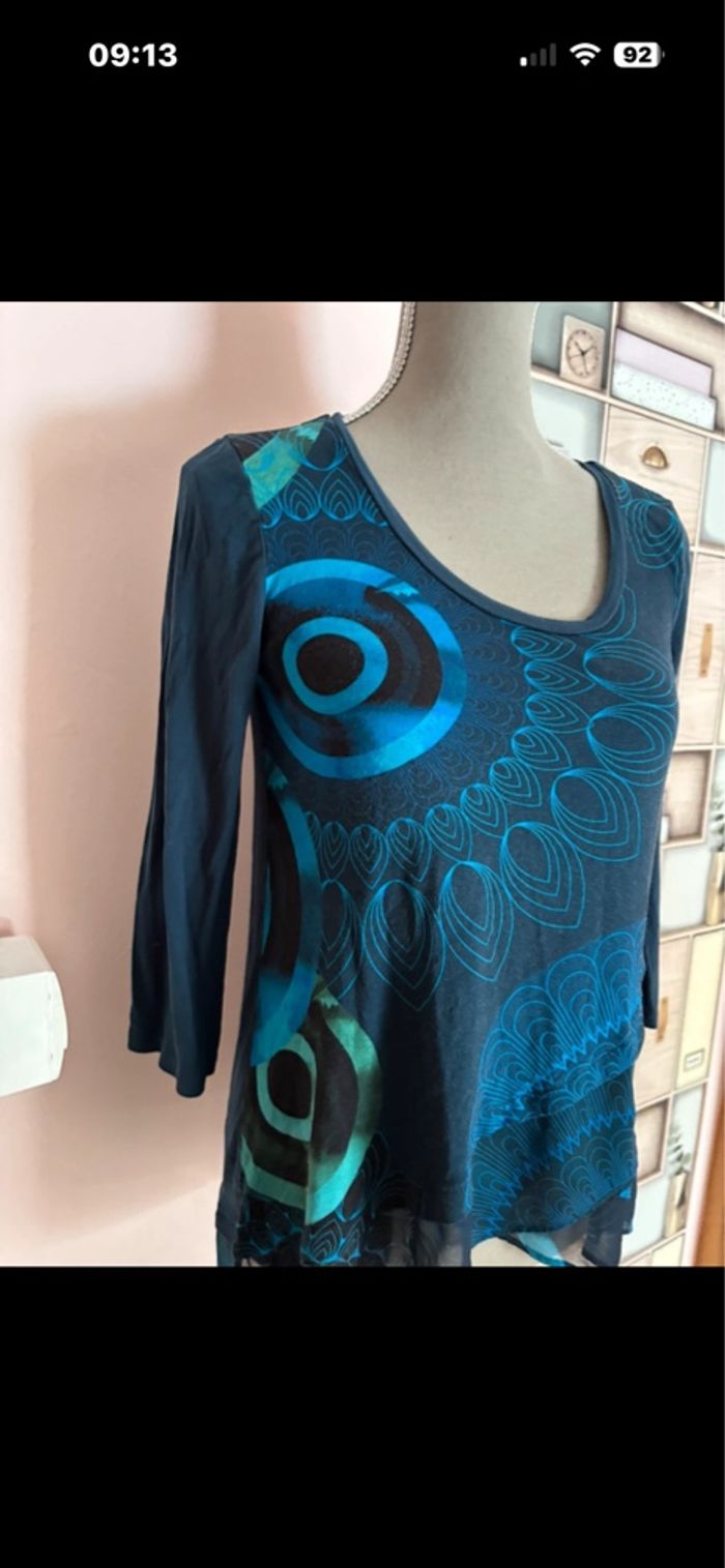 Très jolie blouse manches 3/4, asymétrique Desigual. Longueur devant 62 cm, derrière 65 cm. Largeur à plat d’aisselles à aisselles 45 cm.