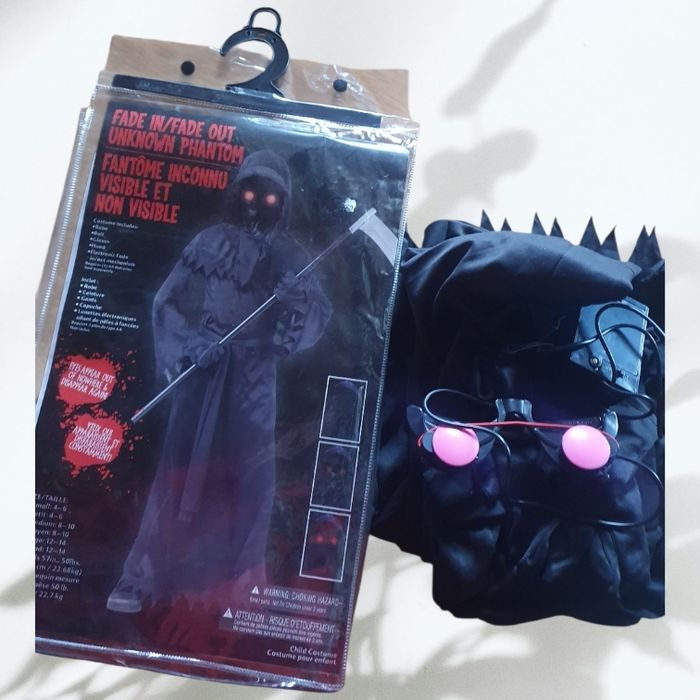 Déguisement garçon fantôme inconnu Taille 4/6ans En très bon état Ce compose : une robe , ceinture, gants,capuche,lunette électronique allant de pâle à foncées