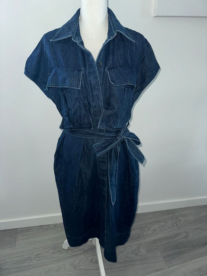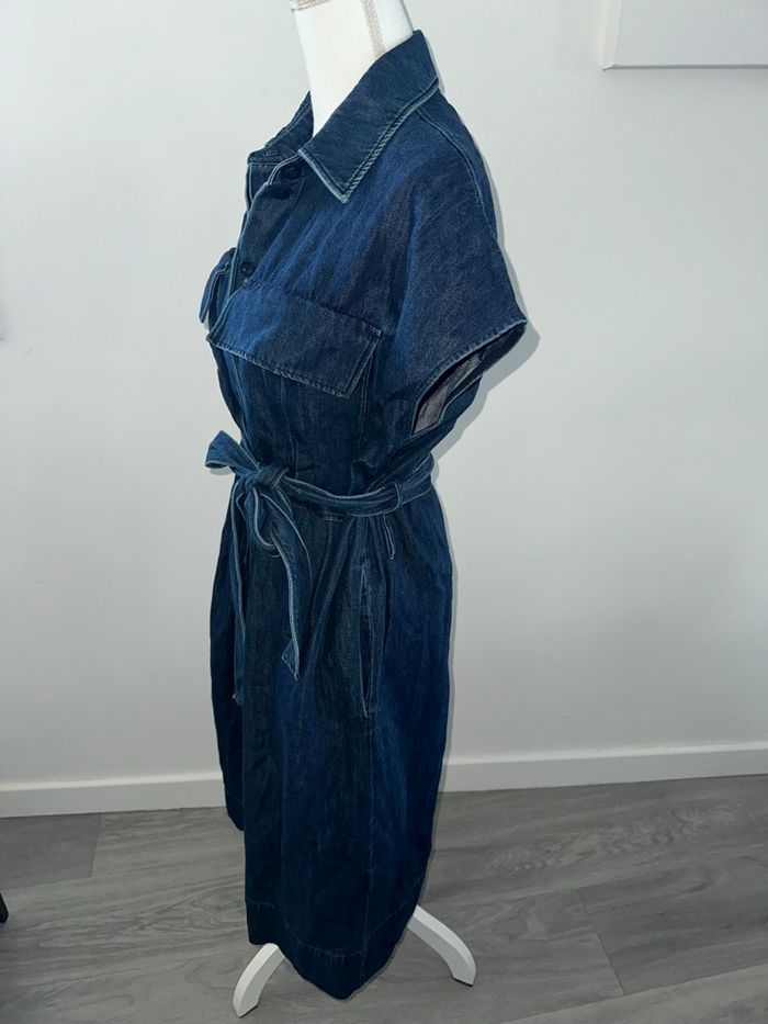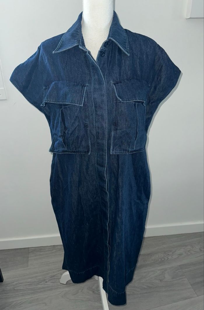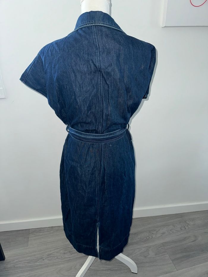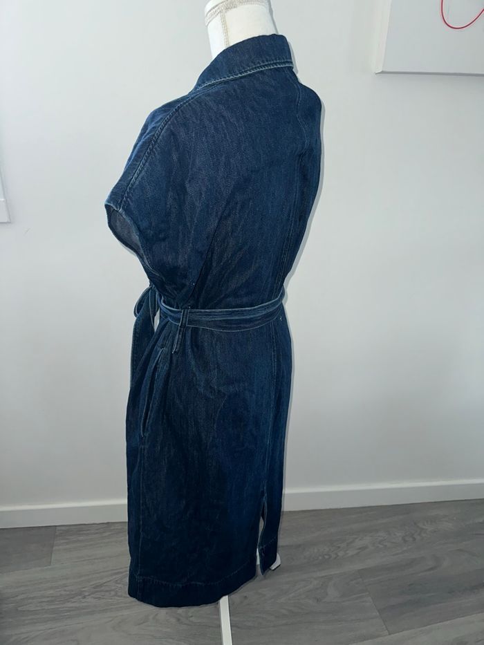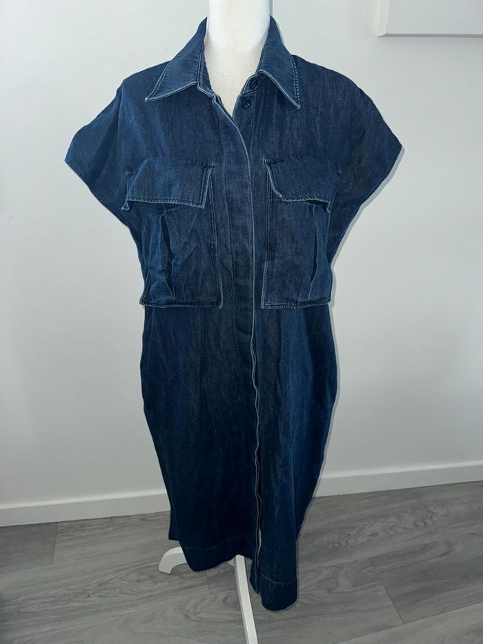 Robe - Excellent état - Taille 36 équivalent S Dimensions en bas de l’annonce - Coupe oversize - Marque COS - Bleu marine, bleu brut - Deux poches au niveau de la poitrine - Passants et ceinture à la taille - Se ferme avec des boutons - Coton et Lyocell Dimensions: - 60cm niveau aisselles - 108cm de long