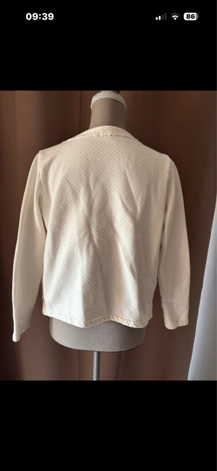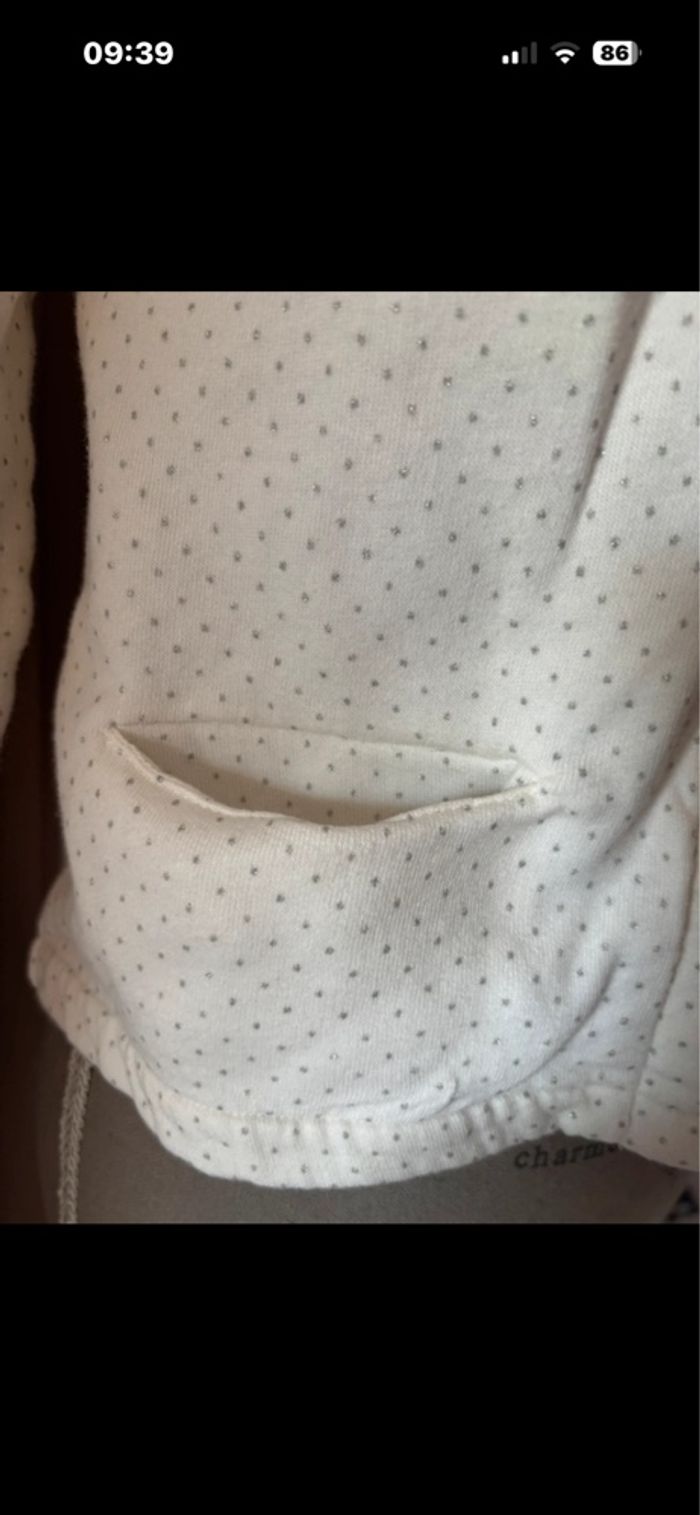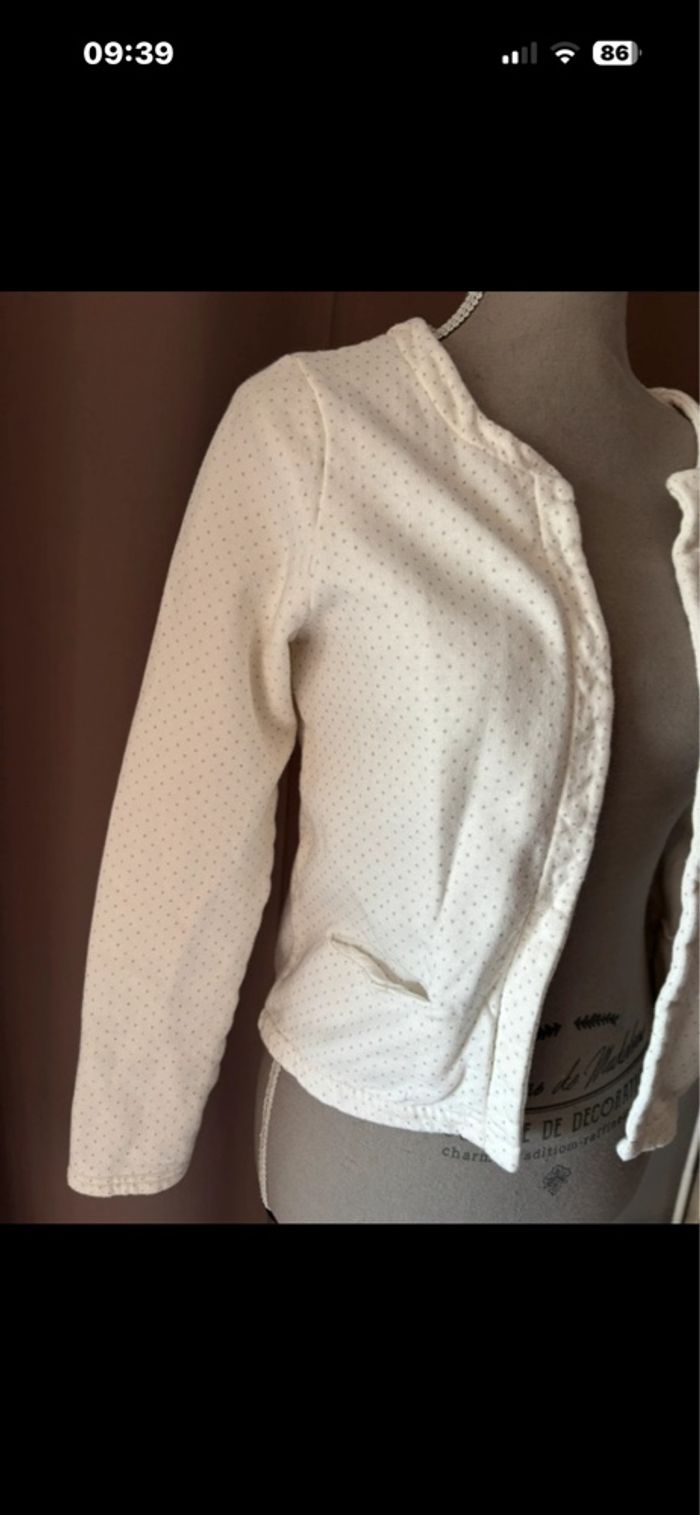 Gilet molletonné blanc avec petits pois argentés. Marqué taille M mais taille petit donc correspond plutôt à une taille S. Longueur 46 cm. Largeur à plat d’aisselles à aisselles 45 cm.