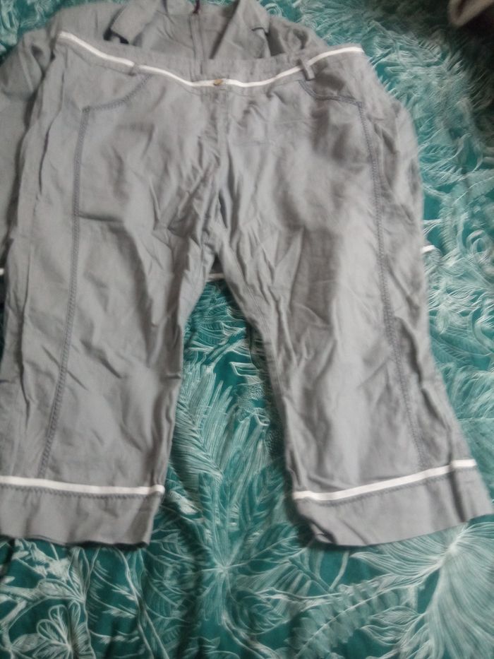 Ensemble composé d'une veste taille 52, 55% lin,45% coton. Tunique taille 52, 100%coton.pantacourt taille 50, 55% lin, 45% coton.