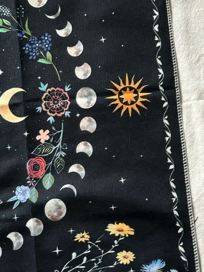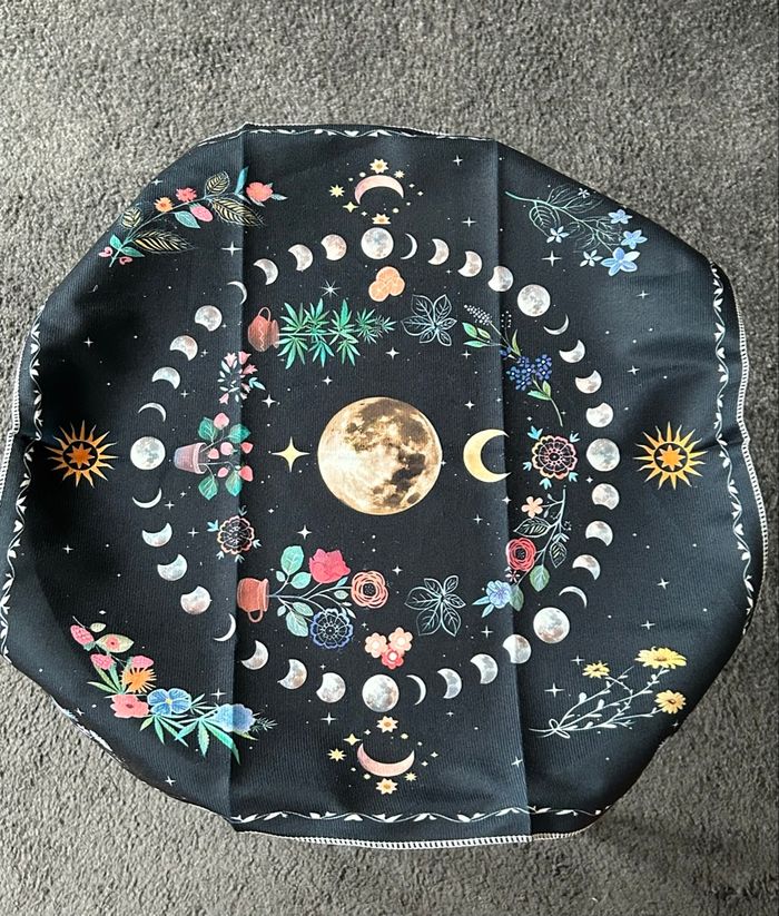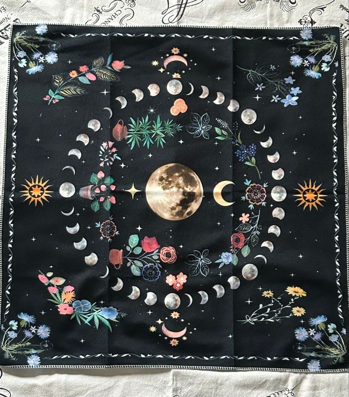Nappe lune Nappe de Tarot Je mets en vente une magnifique nappe noire ornée de représentations de lunes . Cette nappe est conçue pour créer un espace propice aux tirages et aux guidances spirituelles. Que vous soyez chevronné ou que vous commenciez tout juste votre voyage spirituel en tarologie, jeu divinatoire ou pratique de l’astrologie , cette nappe est un ajout indispensable à vos outils rituels. Parfaite pour ajouter une touche mystique à n'importe quelle pièce, cette petite nappe peut être utilisée comme élément décoratif dans un salon, une chambre ou un bureau. Son design unique en fait un excellent choix pour les amateurs d'astrologie ou jeu divinatoire et de décoration intérieure Caractéristiques du produit : - Design Captivant : Le motif circulaire de lune et croissant de lune - Polyvalente : Parfaite comme élément décoratif dans un salon, une chambre ou un bureau. Utilisez-la comme nappe de lecture du tarot, d’autel pour la divination, les rituels ou la pratique spirituelle. - Qualité : Fabriquée en tissu doux et durable, avec une surface lisse idéale pour vos cartes et outils délicats. Ses bords nets lui permettent de rester à plat et de se plier facilement pour le transport ou le stockage. - Dimensions : 49 cm x 49 cm. Cette nappe neuve délimite clairement l’espace de travail pour vos tirages de tarot. Autres Utilisations : - Base parfaite pour des boules de cristal , des installations de méditation ou simplement comme décoration pour la maison. Envoi rapide et très soigné ou remise en main, propre possible à Chartres, secteur, cathédrale.