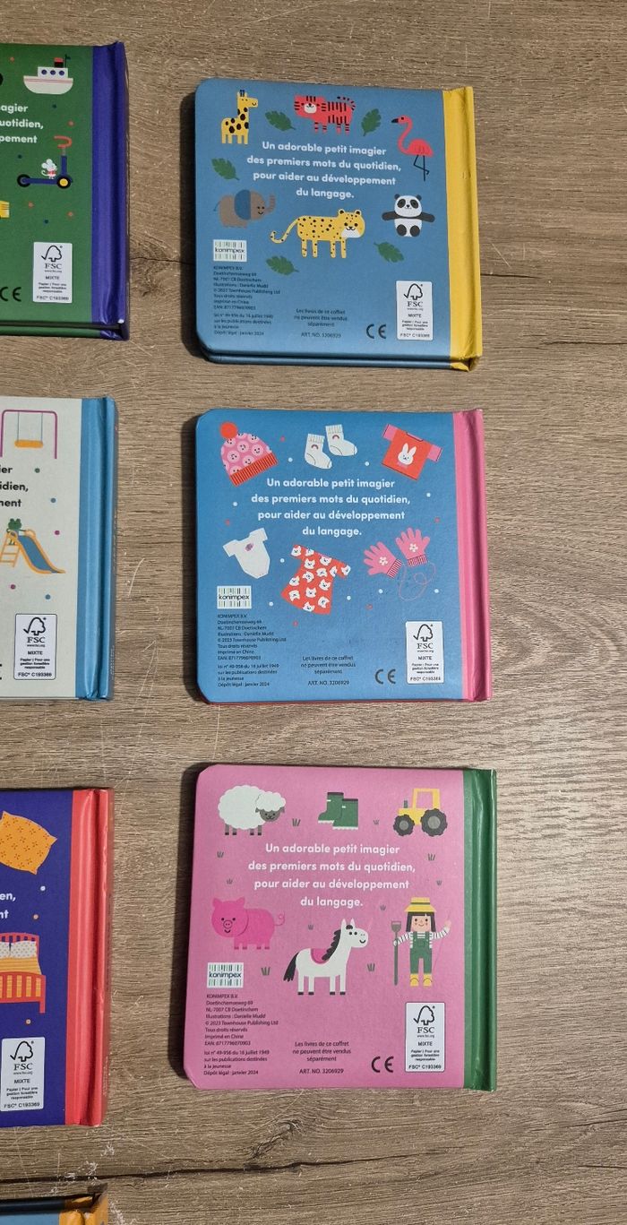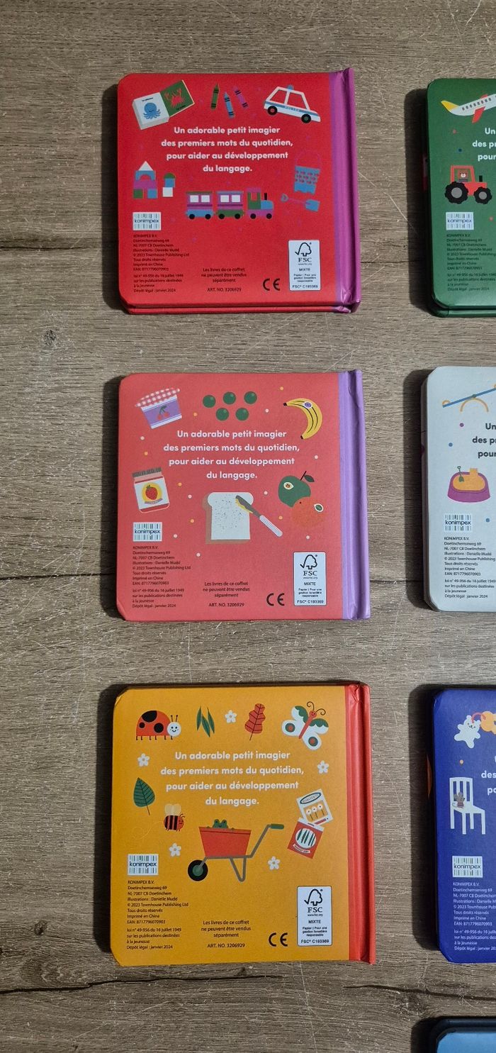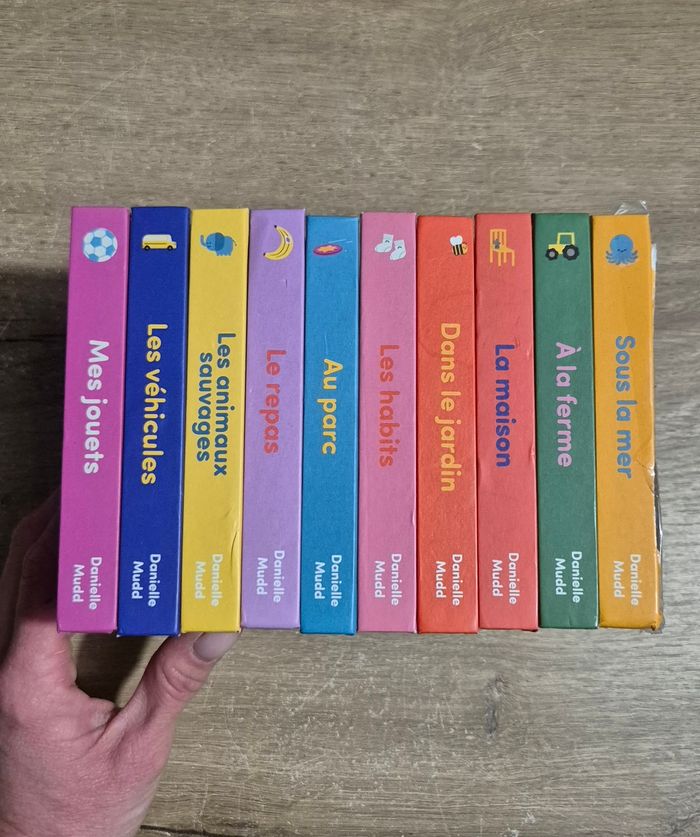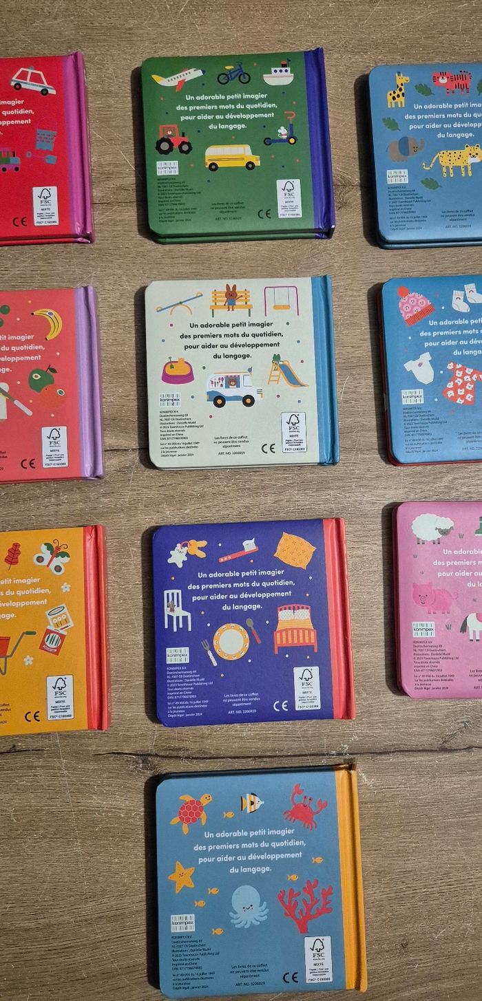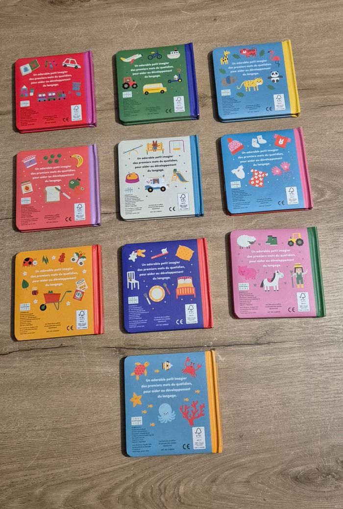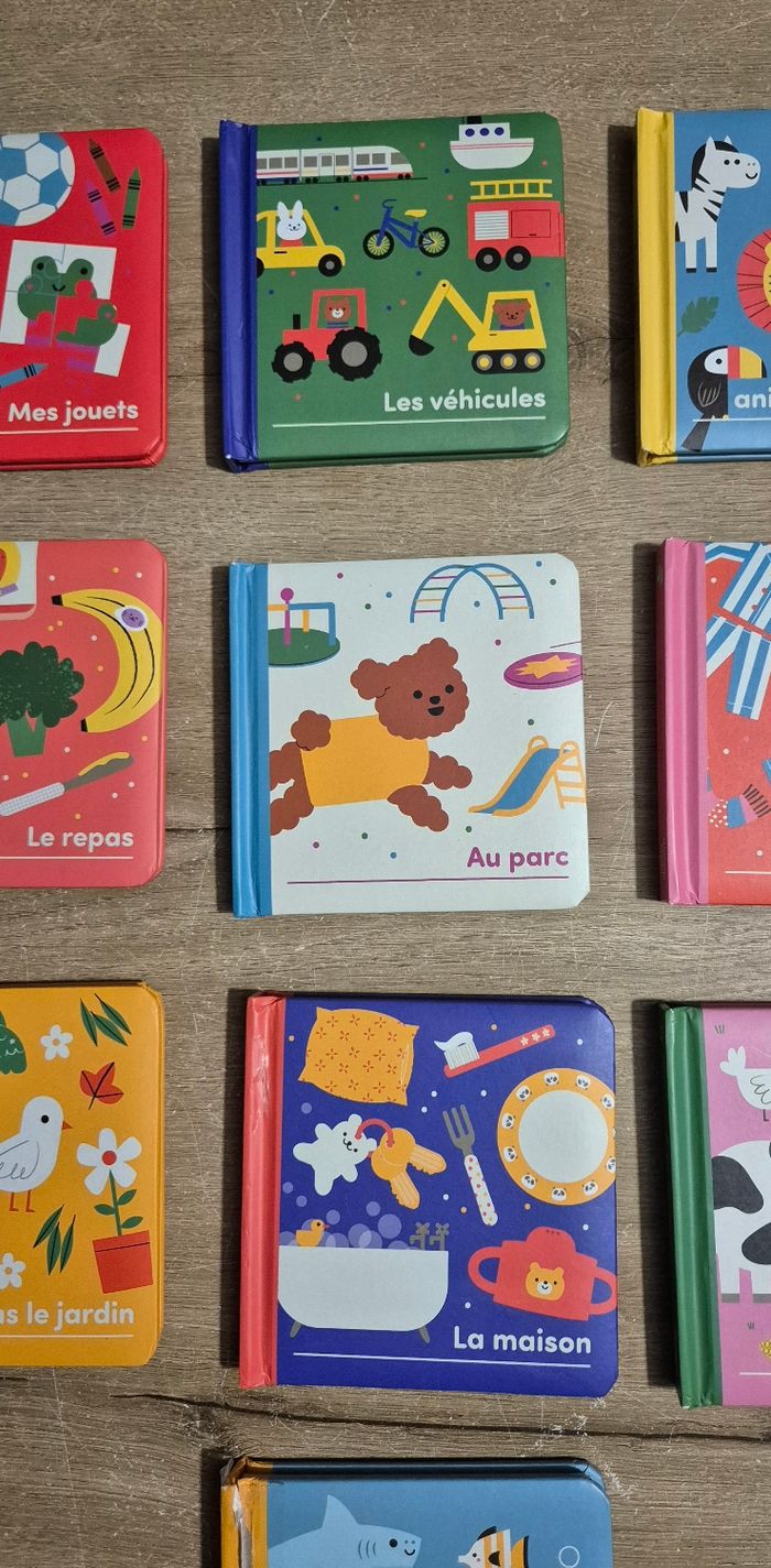 Lot de 10 petits livres imagiers à pages cartonnées : Mes jouets, Les véhicules, Les animaux sauvages, Le repas, Au parc, Les habits, Dans le jardin, La maison, A la ferme, Sous la mer Éditions Konimpex Très bon état (juste Sous la mer qui a la couverture abîmée, voir photo)