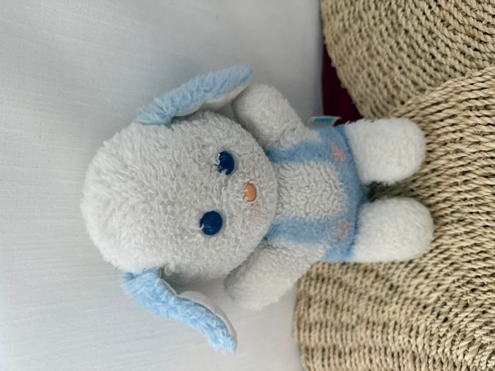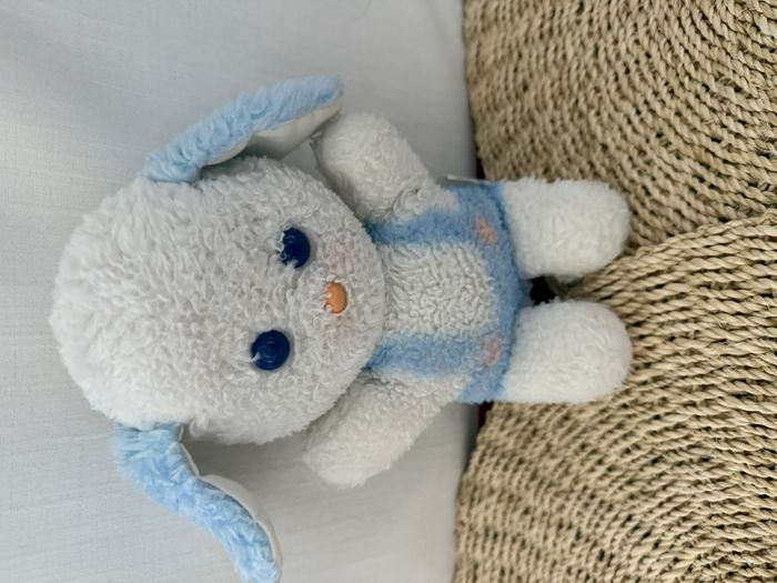 Peluche doudou chien vintage PASTEL blanc bleu rose yeux & nez durs 22 cm  - photo numéro 1