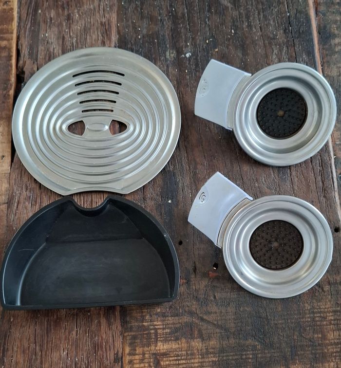 lot de 4 accessoires SENSEO, une plaque repose tasse en inox, un réceptacle et 2 porte dosettes (2 tailles), bon état 8€ le lot de 4 accessoires