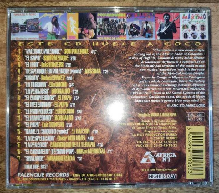 🎵 El Vacile Efectico De La Champeta Criolla 🎵 La champeta est un nouveau style musical né au cœur de la Colombie Réf. Palenque Records PAL 1086 Année de sortie 1998 CD 17 titres 1 - Son Palenque - Palengue Palengue 2 - Son Palenque - El Sapo 3 - Luis Towers - El Liso 4 - Kussima - Despeluque En Palenque (Remix) 5 - Rafael Chavez - Pirata 6 - Elio Boom - La Turbina 7 - Messie Boogaloo - La Pega Josa 8 - El Pupy - El Cumpleanos 9 - El Pupy - El Metemono 10 - Elio Boom - El Proprio Loco 11 - Messie Boogaloo - El Manicomio 12 - Luis Towers - El Papa 13 - El Halcon - Dame El Chiquito 14 - Oscar William - La Despelucada 15 - Candido Dr De La Terapia - La Pea Coco 16 - Milton Mendoza - El Caramelo (Techno Pop) 17 - Wganda Kenya - Shalaode .