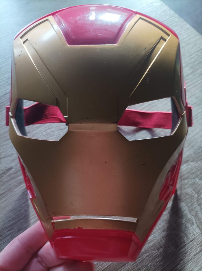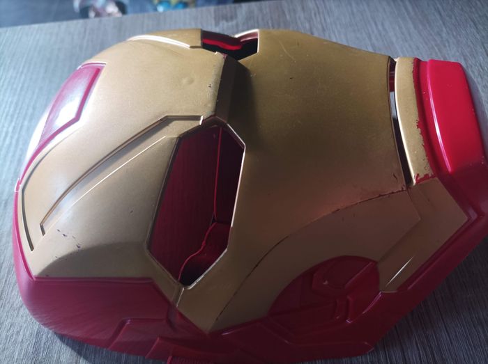 Masque en plastique Iron Man Taille enfant, réglable a l'arrière de la tête, intérieur en mousse au niveau des yeux pour le confort. Bon état, quelques endroits où la peinture est partie (visible sur les photos)