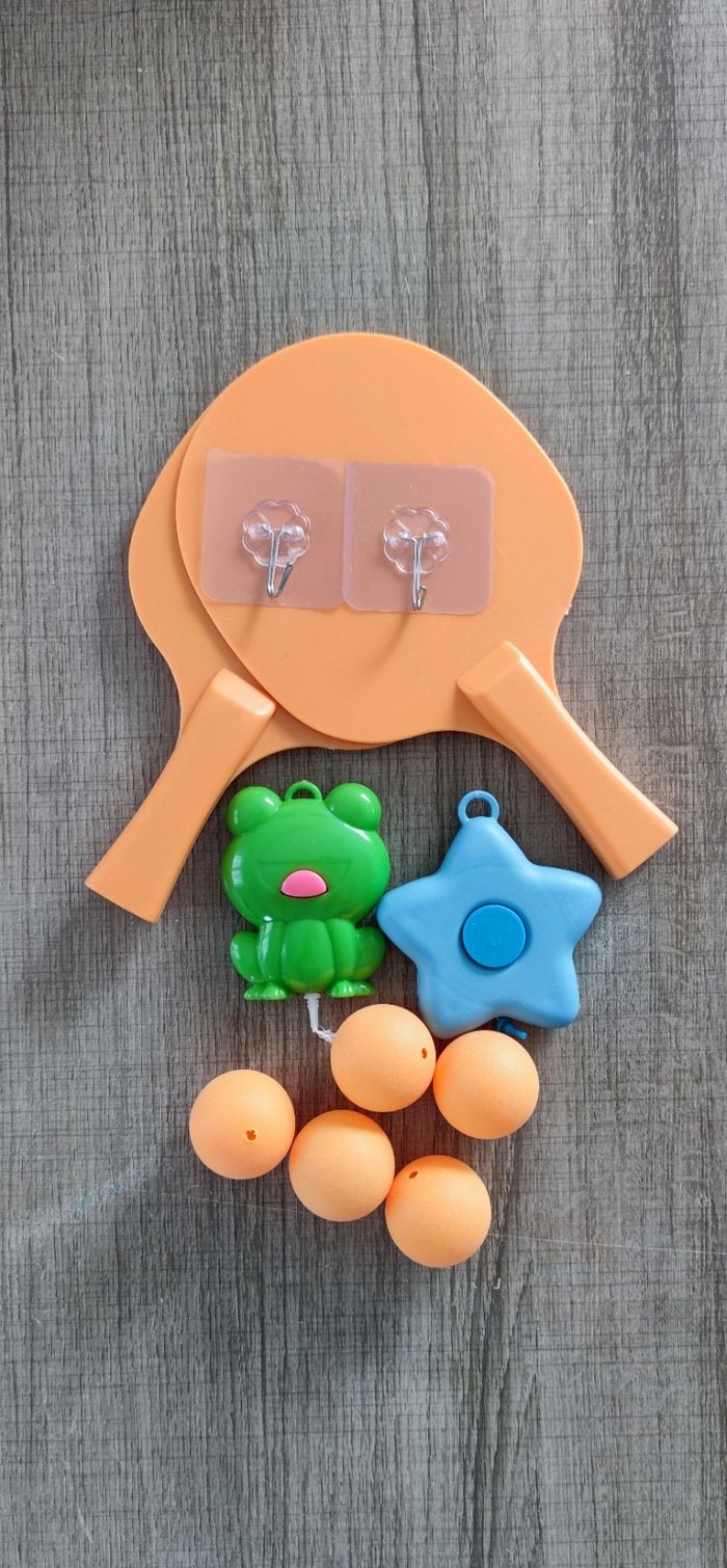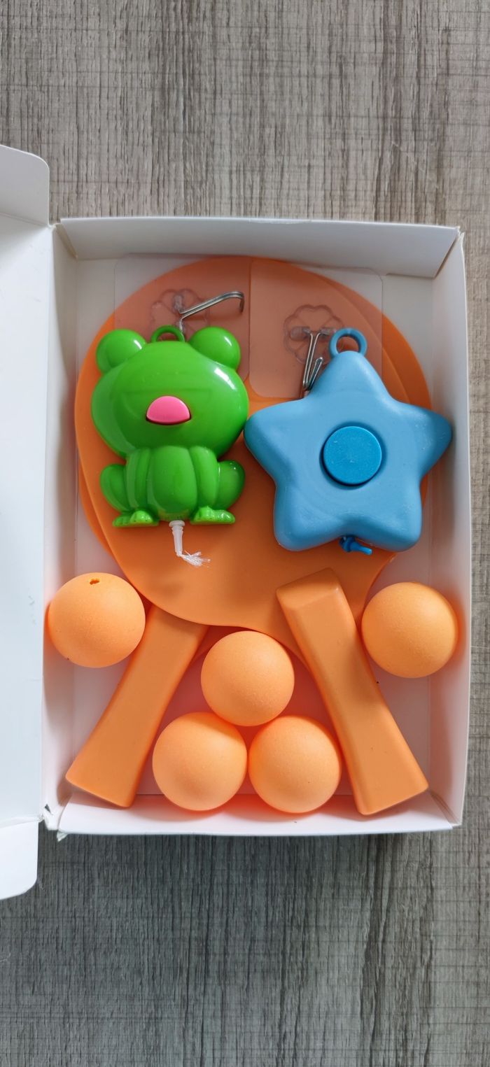 Jeu de tennis de table d'intérieur à suspendre de couleur orange. Jouet en plastique ABS d'auto entraînement pour adulte et enfant. Neuf dans son emballage d'origine, expédition dès le lendemain Le pack comprend : - 2 raquettes orange - 5 balles orange - 2 crochets transparent - 1 entraineur grenouille vert - 1 entraineur étoile bleu Prix 6€