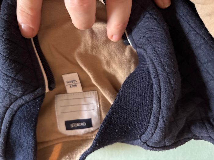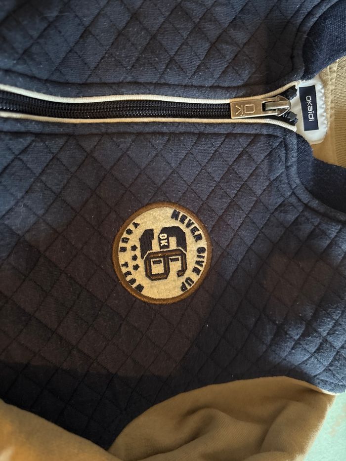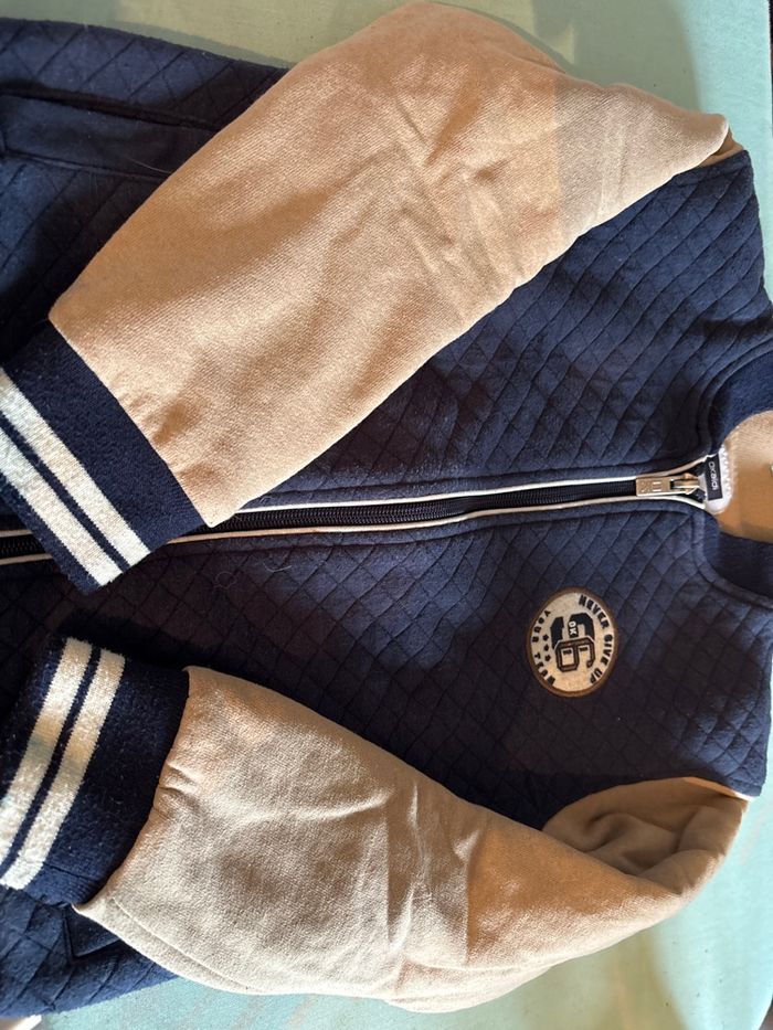 Vends Teddy de marque okaidi taille 8 ans très bon état Il est bleu marine avec les manches beiges et inscription sur le devant