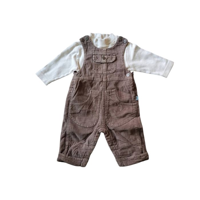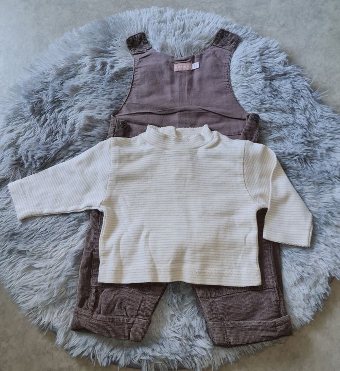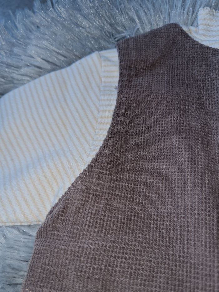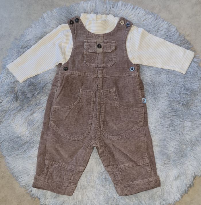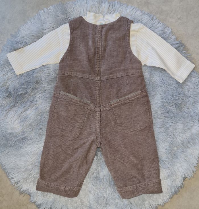 NATALYS ensemble : - salopette beige/marron velours légèrement côtelé, doublée, pressions entre-jambes boutons sur côtés et bretelles - t-shirt rayures tons crème/jaune clair boutons au dos #lesplacardsenfoliebébégarçon #3mois