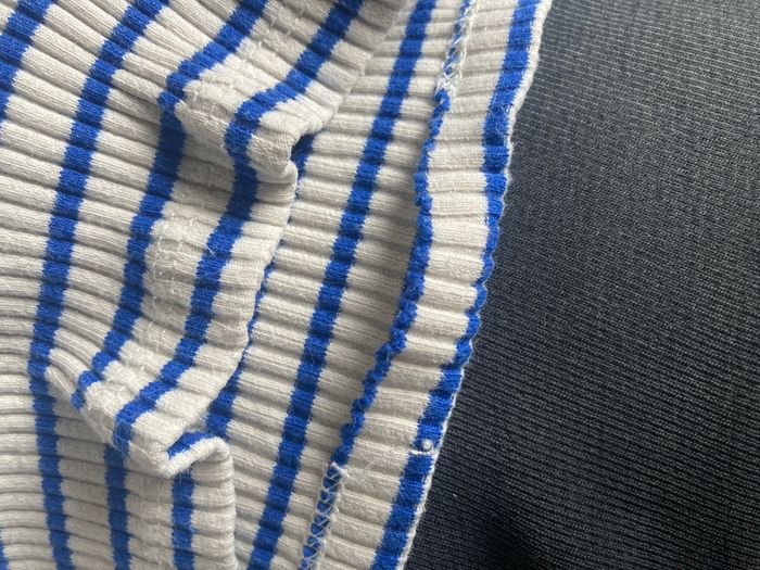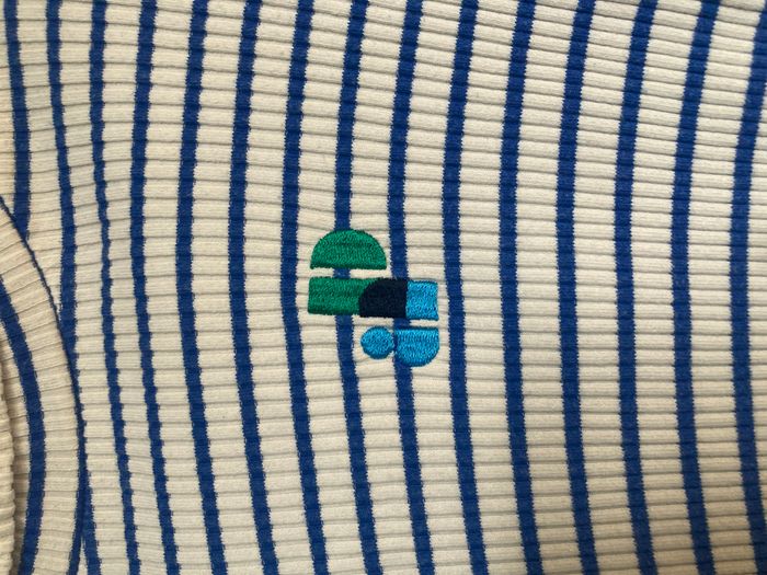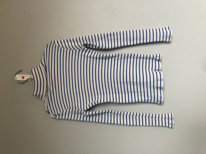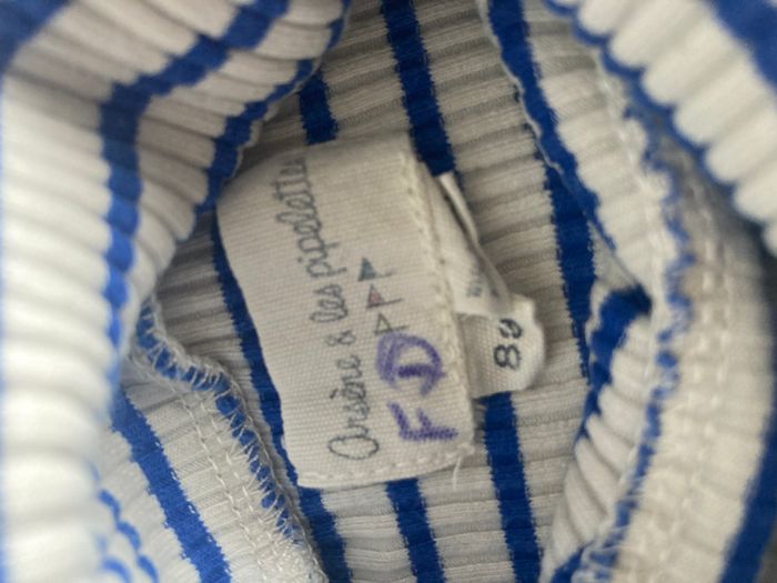 Haut à col roulé de la marque Arsène et les Pipelettes, taille 8 ans. Marinière à rayures bleu marine et blanc crème. Matière côtelée extensible. Petit logo brodé sur la poitrine et finitions ondulées. Bon état général. À noter : 1. Une petite couture est décousue sur le bas (voir photo), très facile à reprendre. 2. Le prénom de mon enfant est inscrit sur l'étiquette intérieure (voir photo). #Worryfree_8ans #arseneetlespipelettes #mariniereenfant #8ans #mariniere #modeenfant