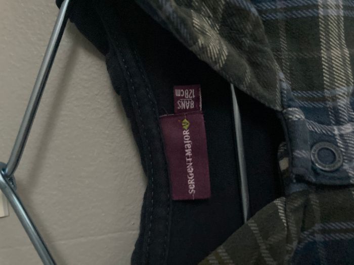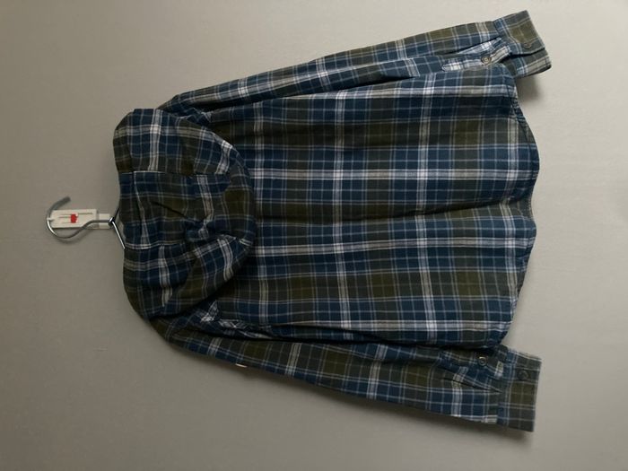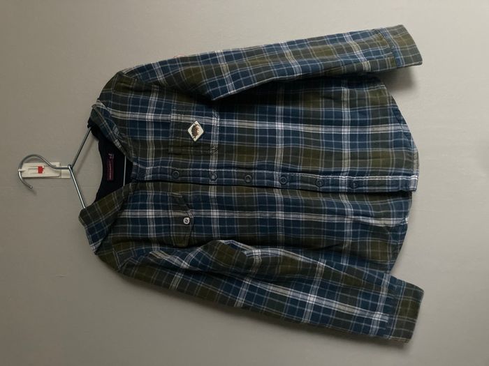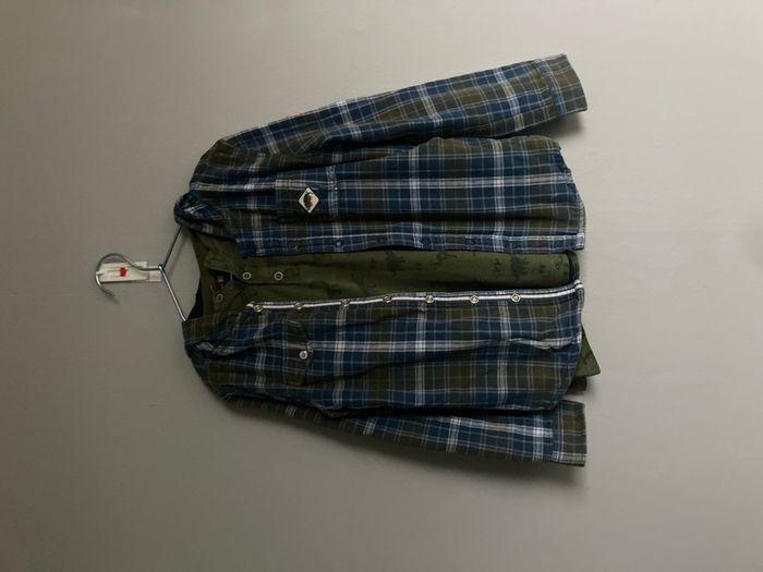 Ensemble très sympa de la marque Sergent Major, taille 8 ans (128 cm). Il se compose de : * Une surchemise à carreaux : Tons kaki, bleu marine et blanc. Elle est boutonnée avec de jolis détails, idéale portée ouverte sur le t-shirt. * Un t-shirt assorti : Coloris kaki avec un motif dinosaure fun et des détails travaillés sur le devant. En rès bon état général. L'ensemble a été soigneusement entretenu, le tissu est impeccable et les couleurs sont bien préservées. #Worryfree_8ans #sergentmajor #8ans #dinosaures #kaki #ensemblegarcon #modeenfant