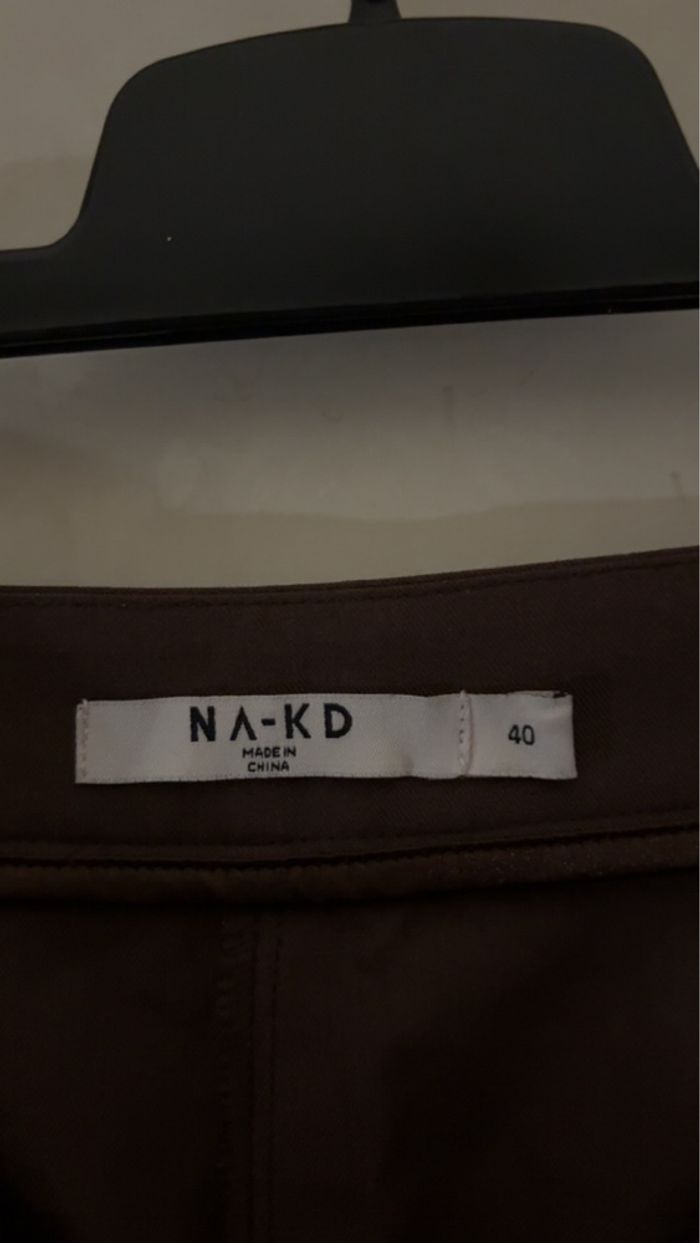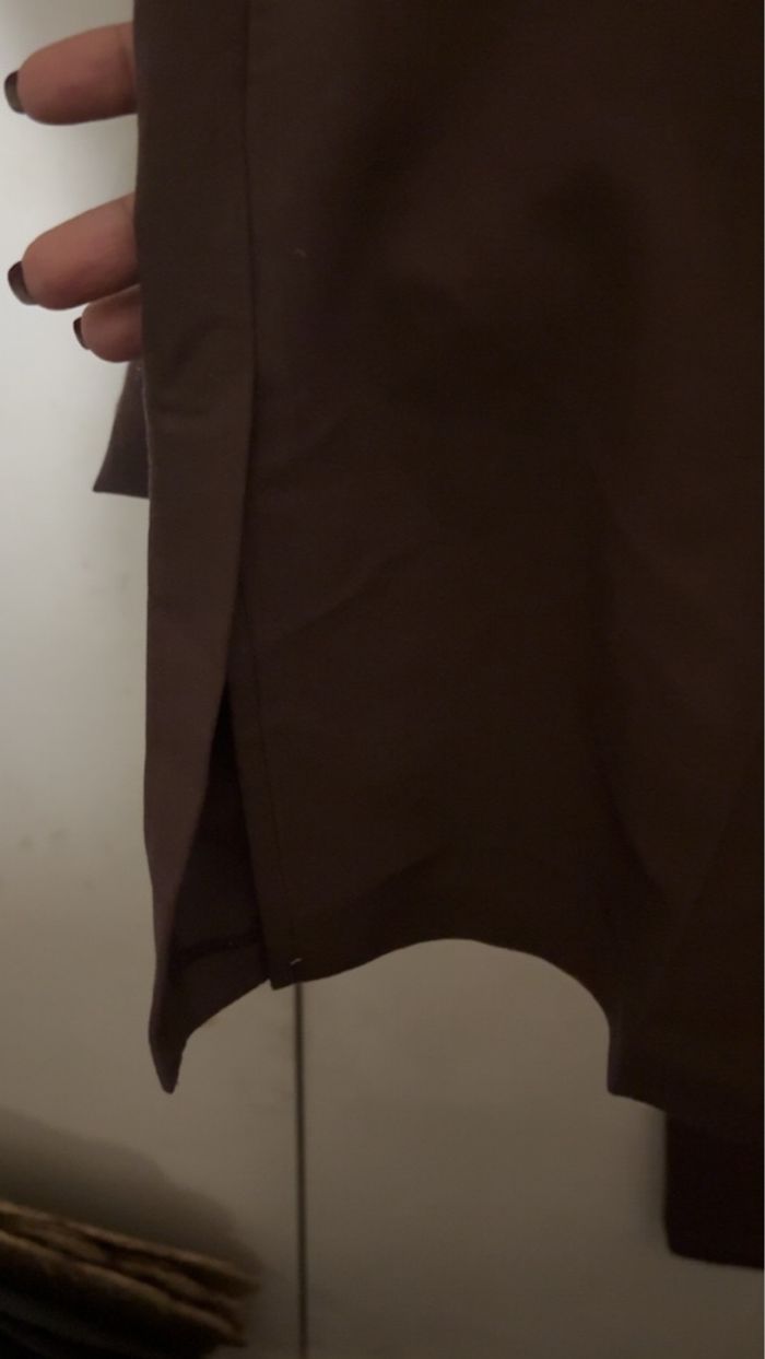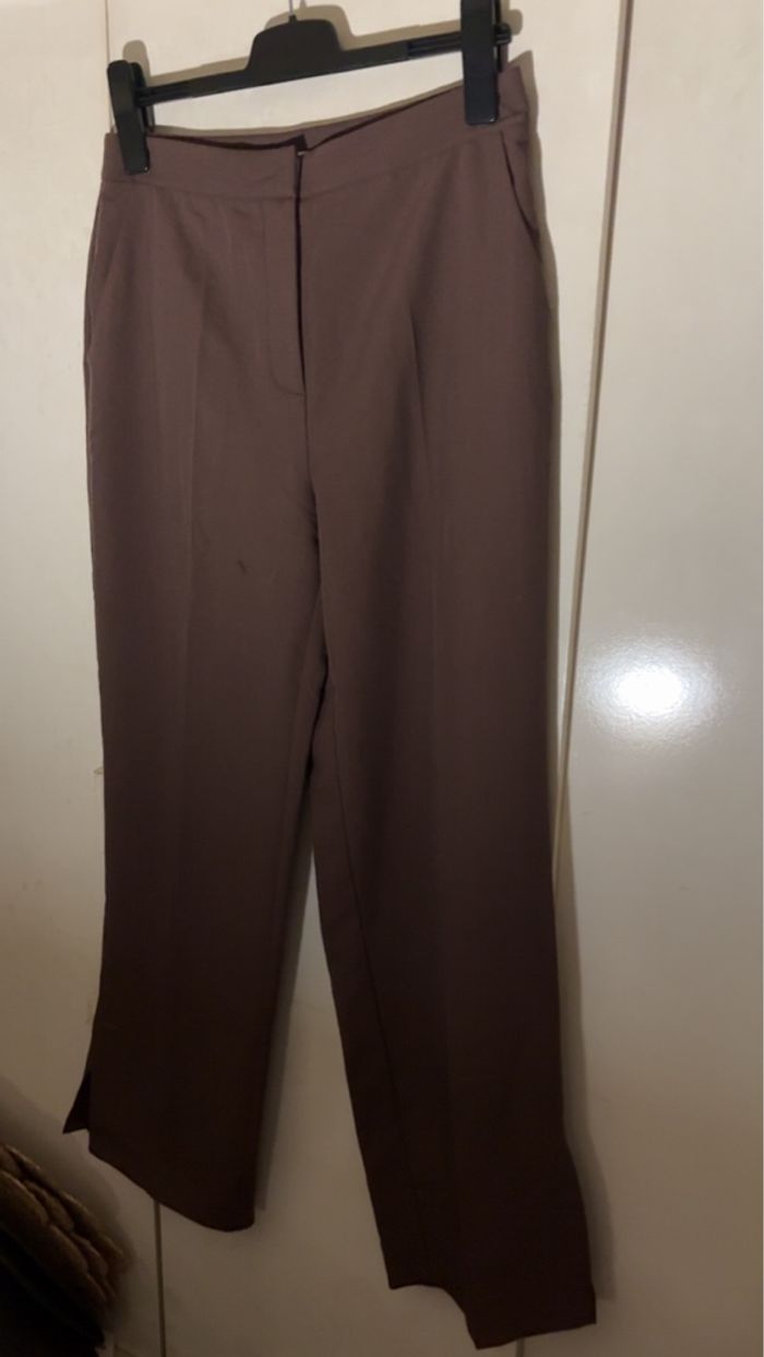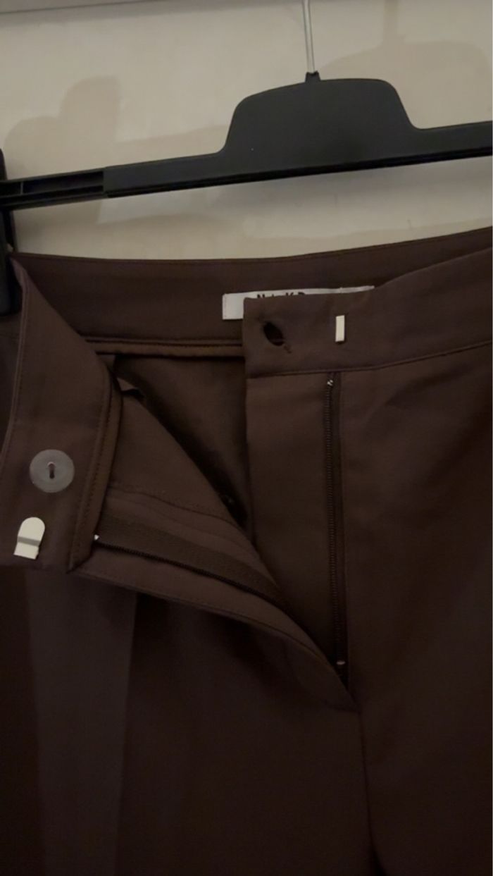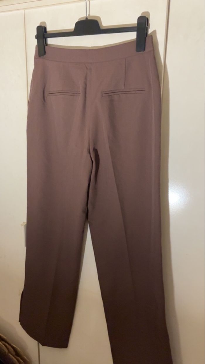Pantalon avec fentes sur le bas. Deux poches latérales, deux fausses poches à l'arrière. Fermeture éclair avec agrafe et bouton dissimu-lés. Bouloches au niveau des poches et à l'entre-jambe. L'ourlet du coté droit a été recollé avec une bande adhésive. Taille 40.