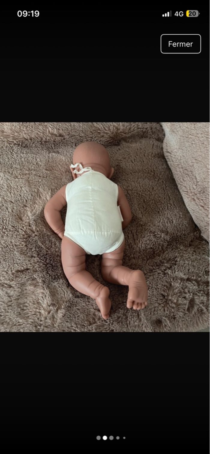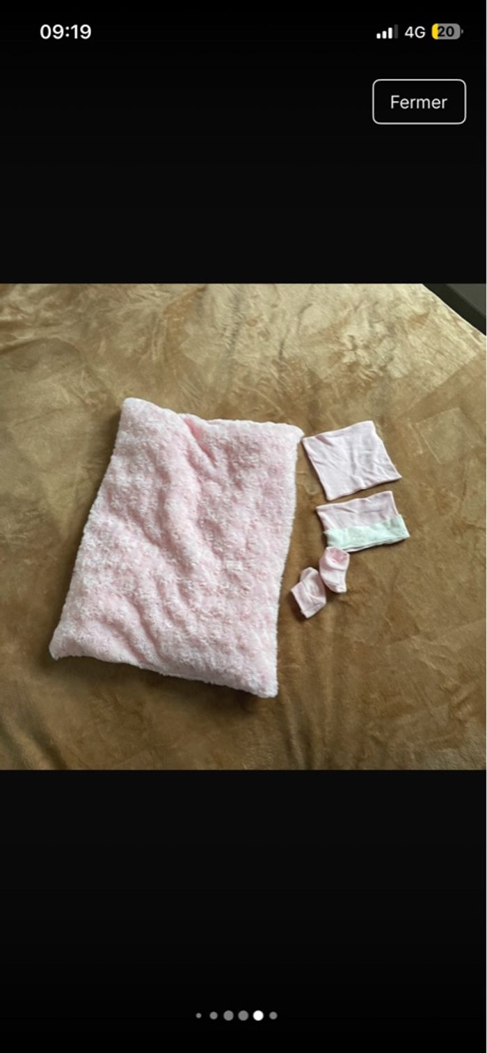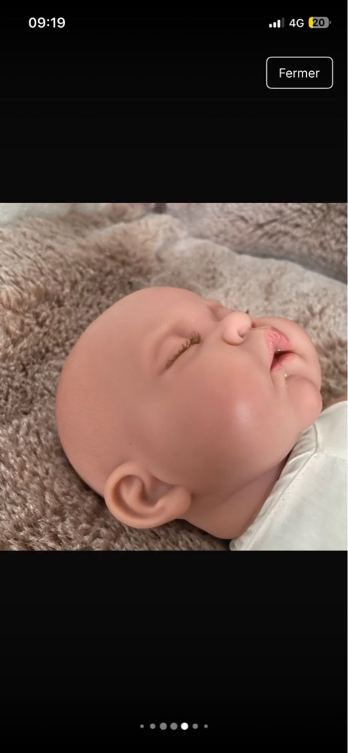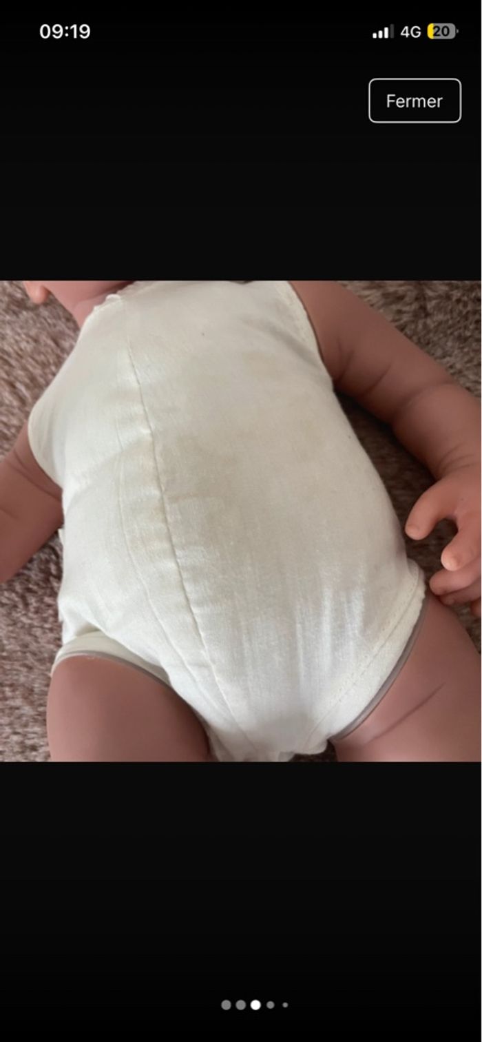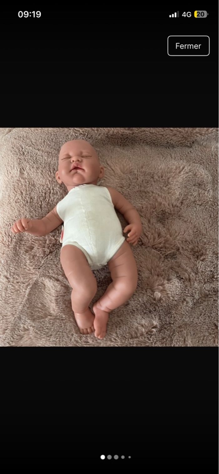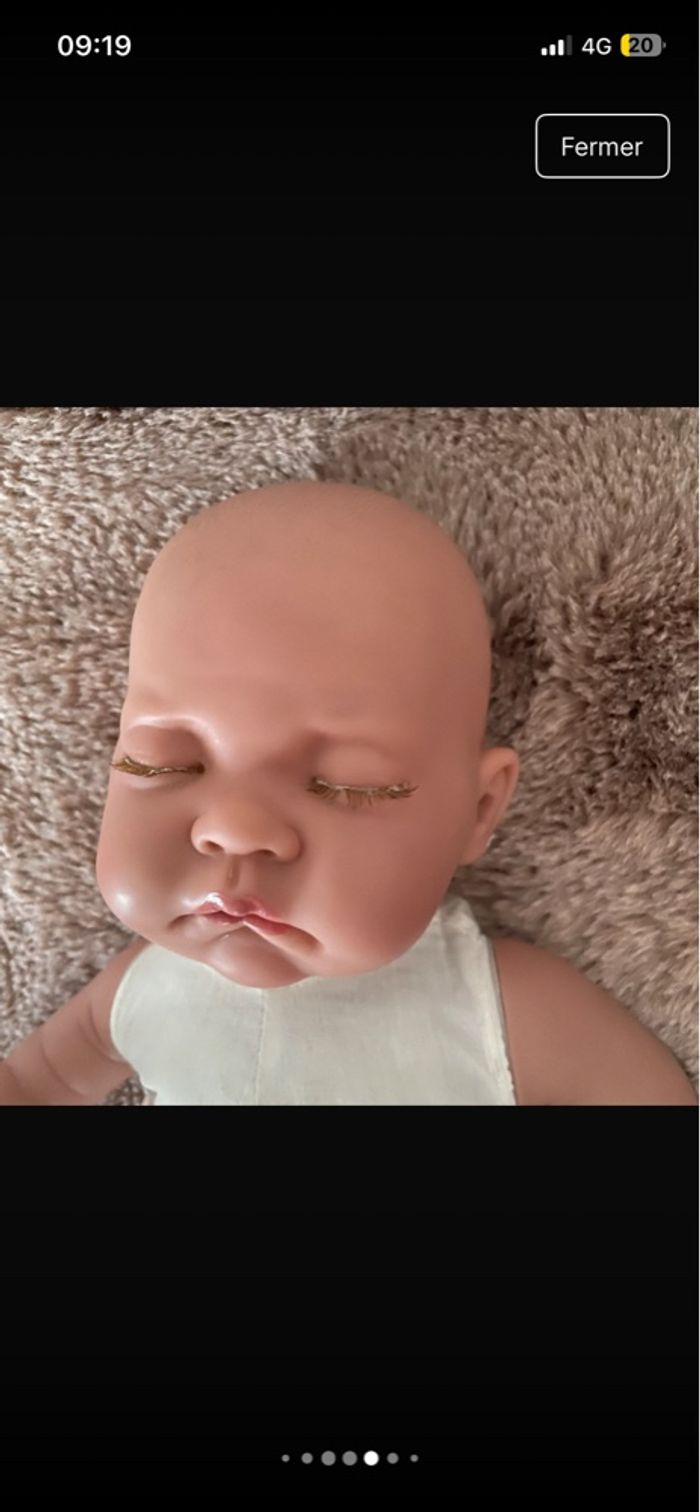 Bébé reborn et ses accessoires, le bébé est en parfait état, absolument pas abîmé, le tissu ne présente pas de tache. Il y a avec une bonnet, des chaussons, un petit coussin.