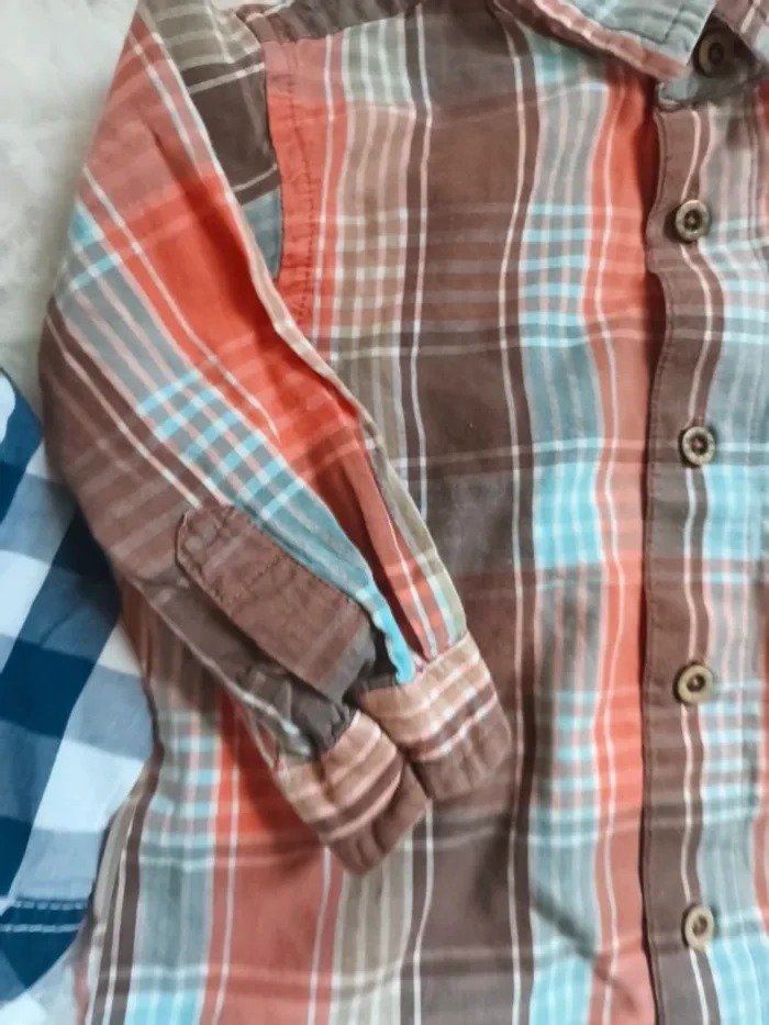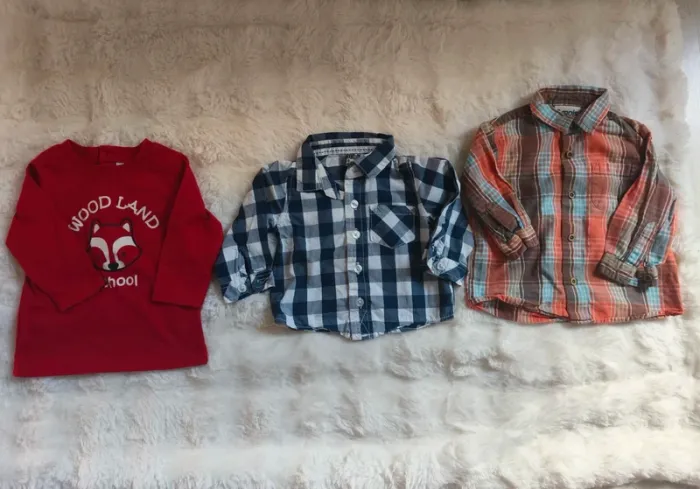 🔹 1 tee-shirt manches longues rouge Motif renard Sans marque Matière douce et confortable 🔹 1 chemise à carreaux orange/marron Manches longues Sans marque Style casual, facile à assortir 🔹 1 chemise à carreaux bleus Manches longues Marque : Tape à l’œil Classique et élégante 📦 Envoi rapide et soigné 💬 Idéal pour un petit garçon – parfait pour la saison
