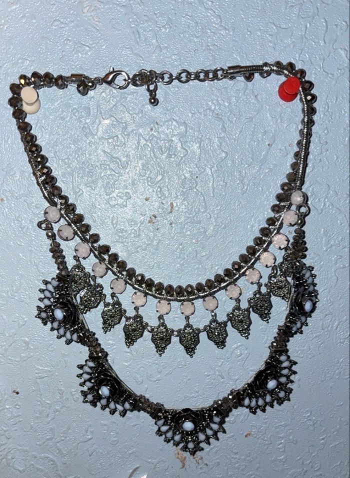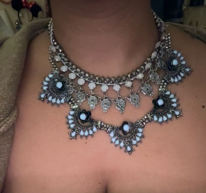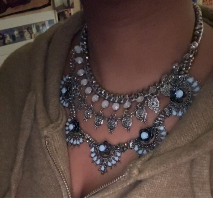 Collier fantaisie bleu. Avec strass et pierres, en très bon état.