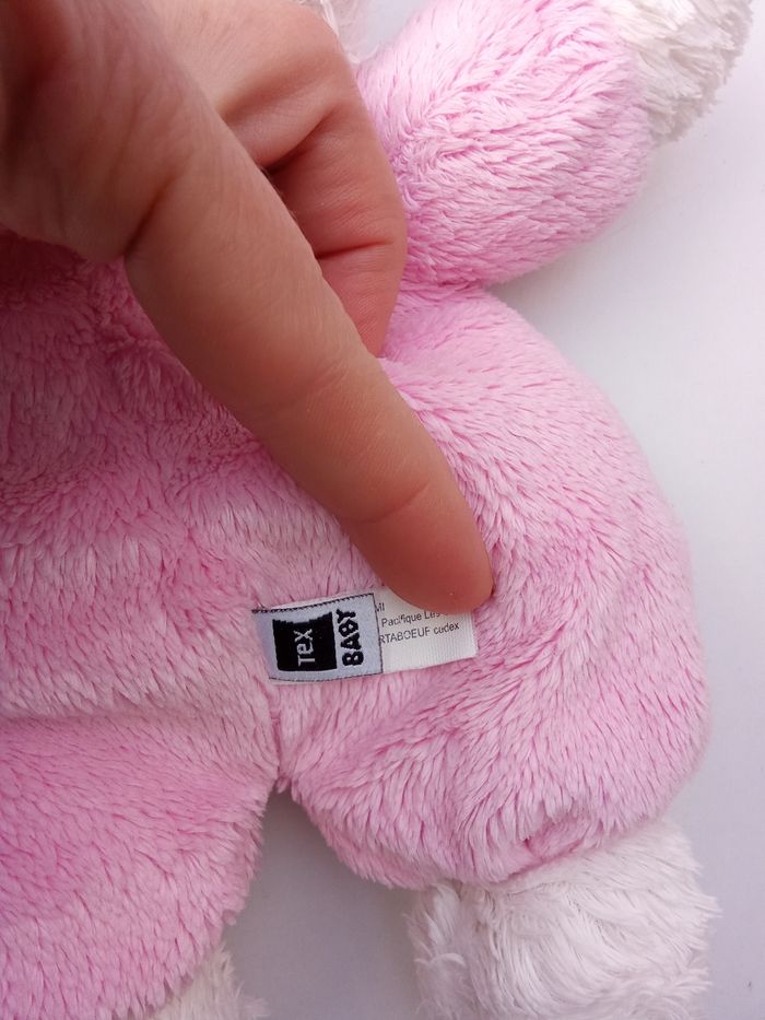 Doudou ours pour bébé fille marque tex baby, 2 étiquettes présentes. Bon état général. De nombreux autres doudous enfant également à vendre ds mon dressing et réduction activée