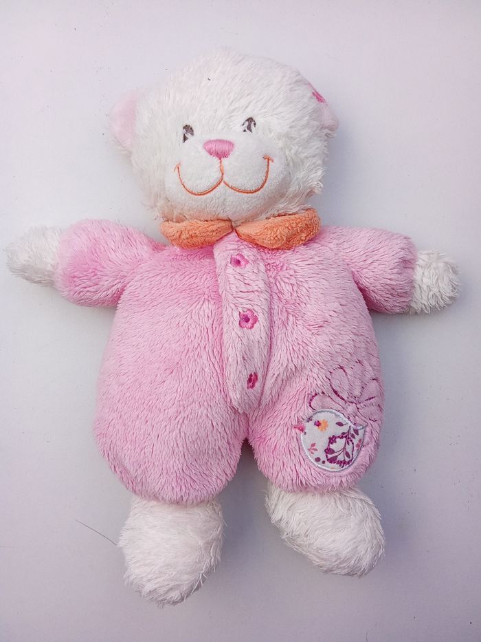 Doudou ours bébé fille rose, blanc, broderie oiseau marque tex baby - photo numéro 1