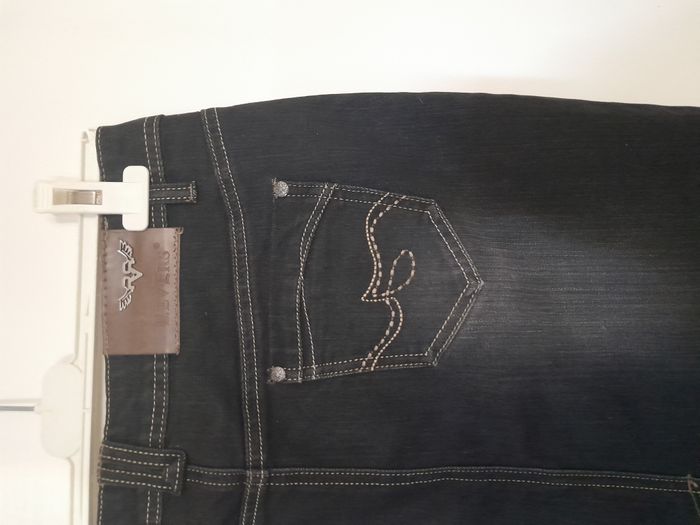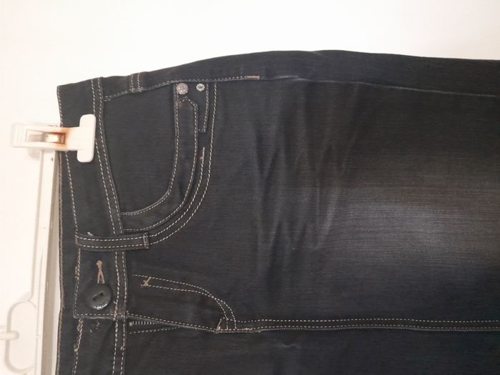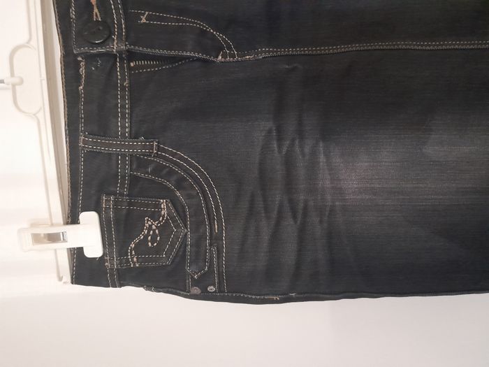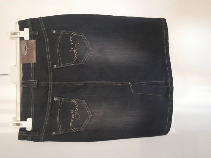 Jupe en jean, 5 poche, fendu derrière Longueur : 50cm, Fente : 14cm Taille en cm : 40 Matière : 95 % Coton, 5 % Elasthanne Marque : Revers