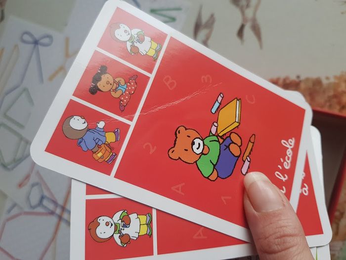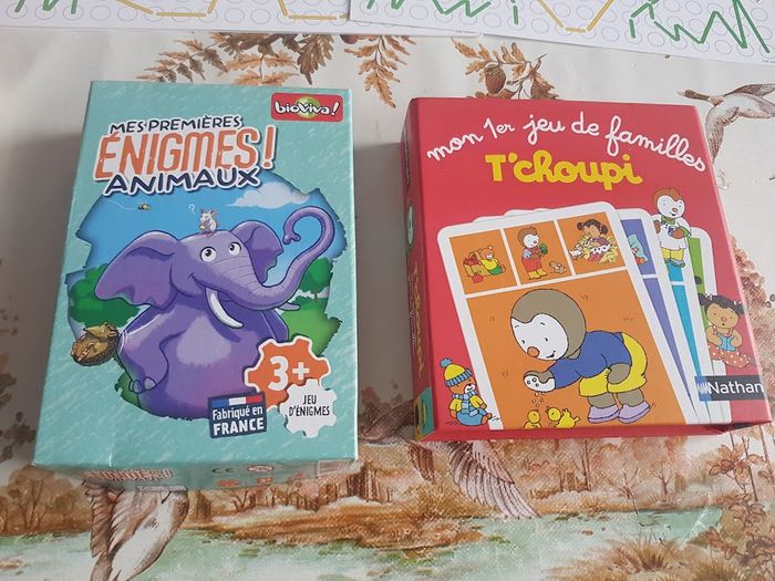 Très bon état général et complet mais il y a une carte plié dans le jeu Tchoupi et une carte modèle troué dans le jeu Filo.
