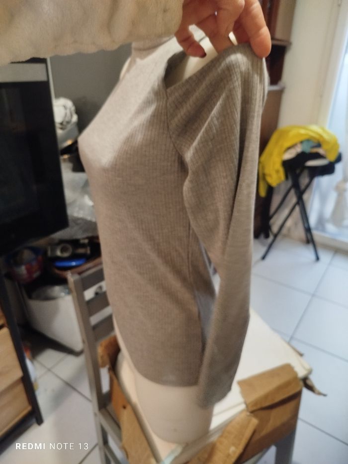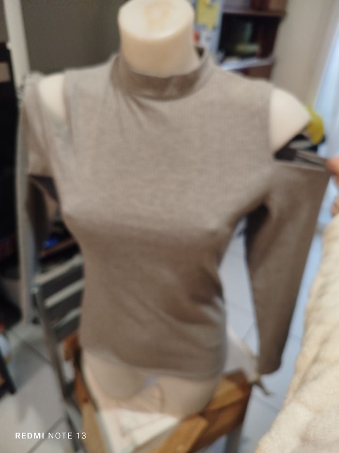 #kytieMfemme. Tee-shirt épaules dénudées côtelé manches longues taille M de marque Amisu col montant neuf 80 % polyester 25 % viscose 5 % élastique 34 cm mais avec les épaules dénudées 42 cm des aisselles 40 cm hauteur 60 cm réf 987